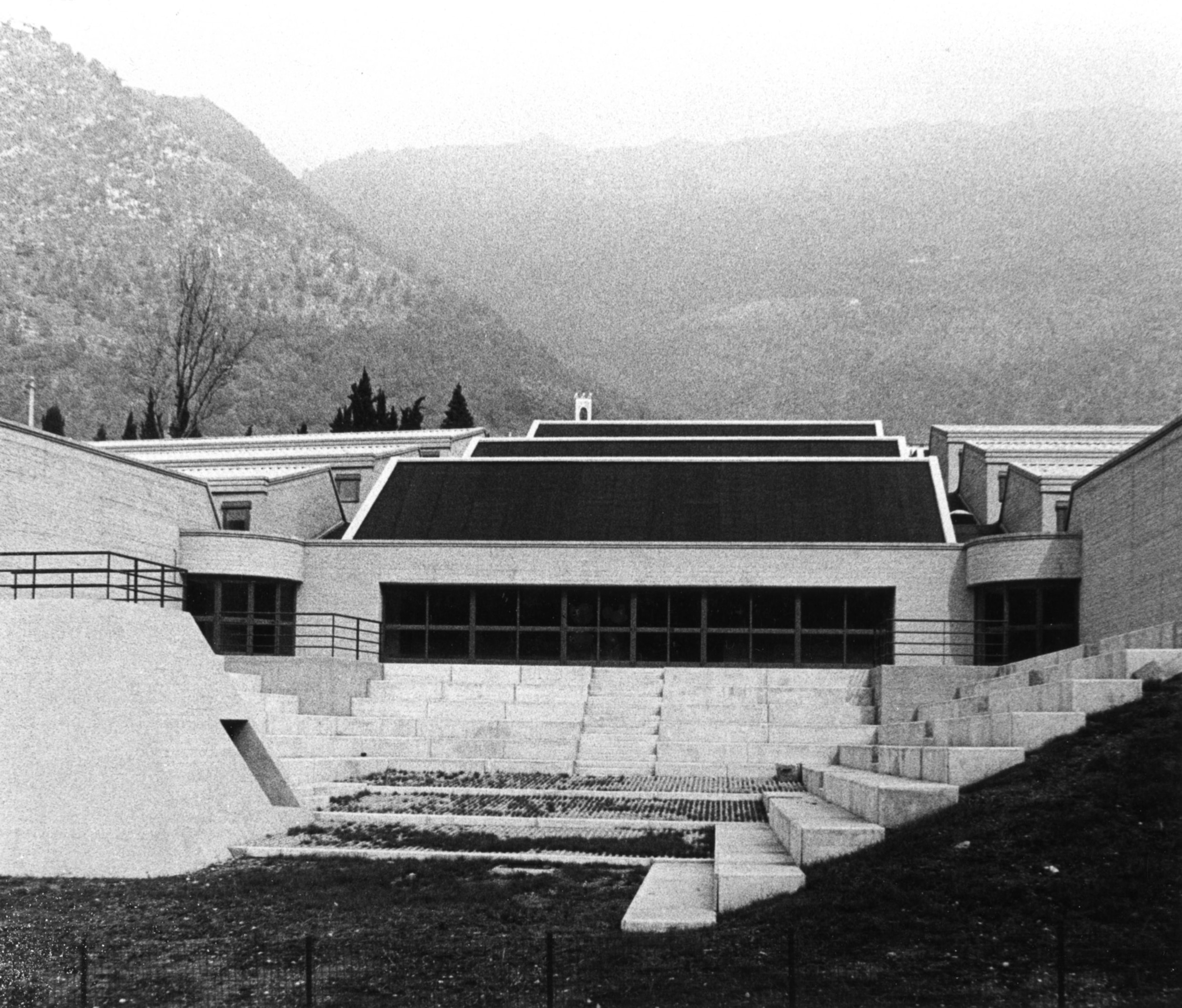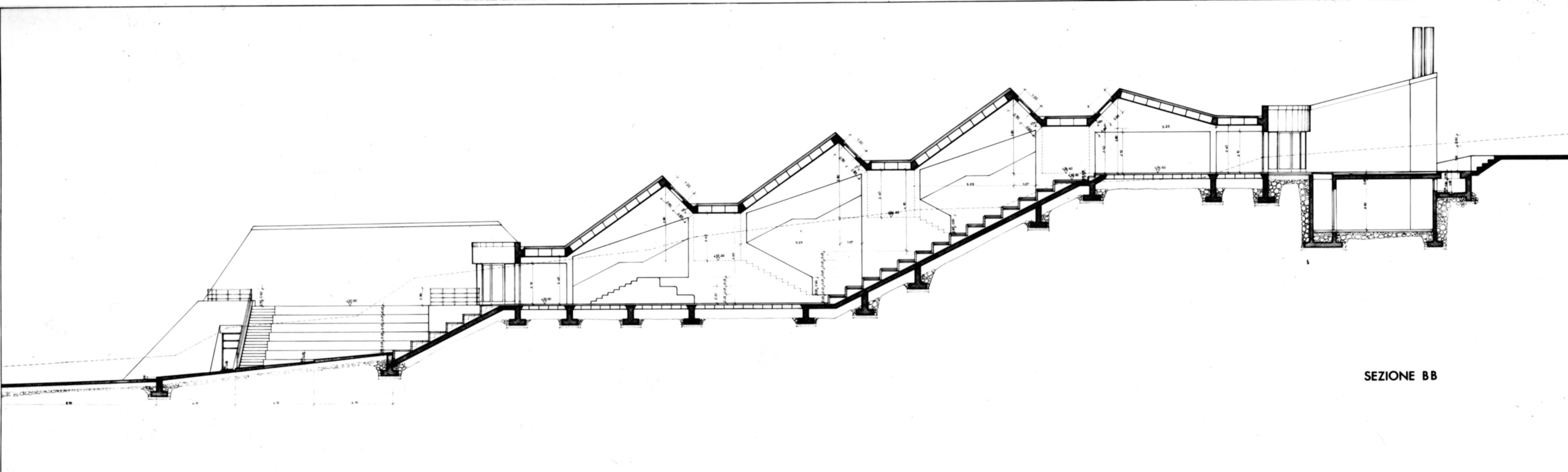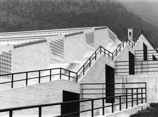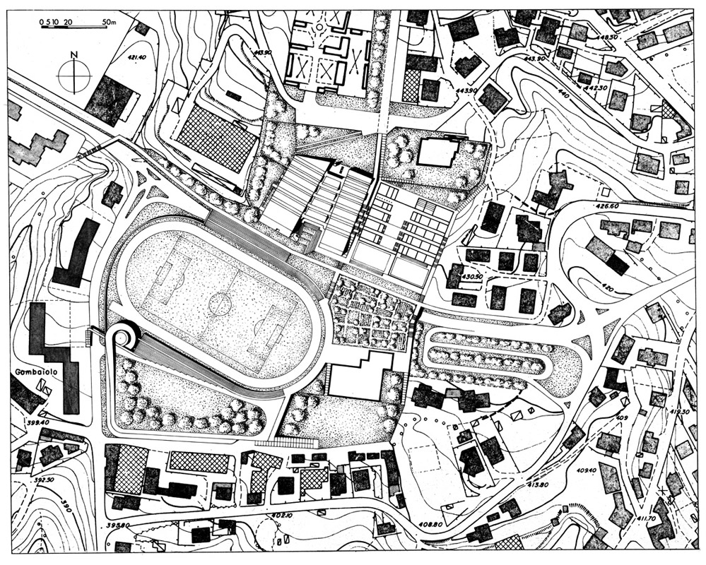 Edifici e spazi aperti prospettano gli uni sugli altri teatralmente, lungo i terrazzamenti che degradano dal piano del cimitero a quello delle scuole, a quello del campo sportivo, della piscina e degli orti, fino al parco che si estende a terrazzo sul bastione dei parcheggi insilati, affacciandosi sulla scena del campo sportivo.