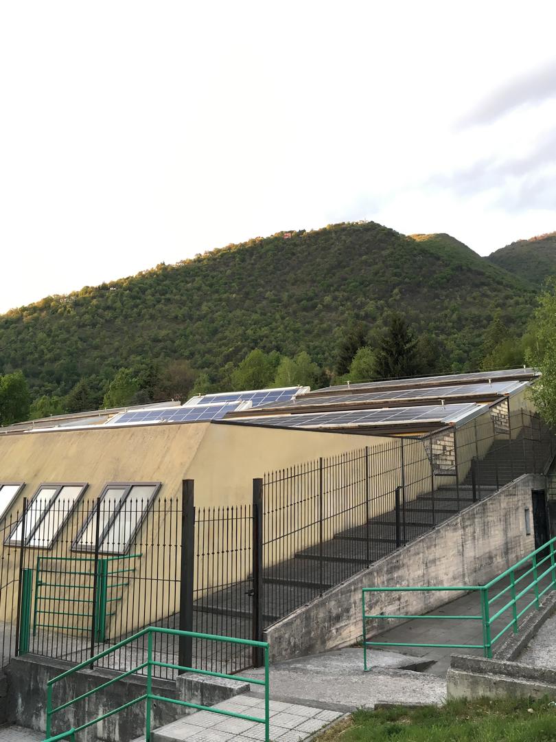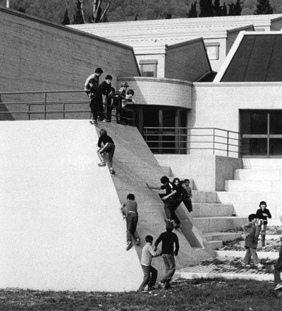 La naturale pendenza del terreno è stata assunta nel progetto per il complesso scolastico–sportivo, fino a caratterizzarne la morfologia e l'organizzazione funzionale tese a garantire il massimo grado di integrazione tra le parti.