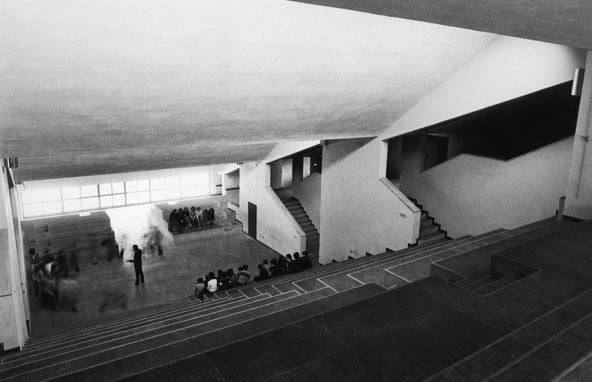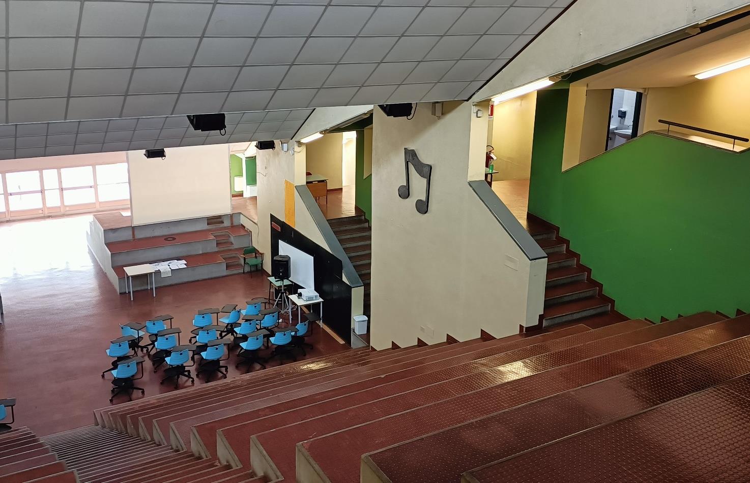 I corpi delle aule e degli uffici amministrativi si sviluppano a gradonate ai lati dello spazio centrale coperto illuminato dall’alto, conformato come teatro, sui quali affacciano tutti i nuclei didattici e di servizio della scuola. Questa disposizione delle aule rispetto al teatro, alla palestra e alla biblioteca garantisce ad ogni attività autonomia di svolgimento, senza interferenze da parte delle altre, anche in caso di presenza di utenti esterni nelle ore di svolgimento della normale attività didattica. Infatti il teatro–auditorio (250 posti) è utilizzabile anche per spettacoli e convegni pubblici; la biblioteca (10.000 libri, con reparti emeroteca, audiovisivi e centro riproduzioni) può funzionare da biblioteca pubblica di zona; la palestra contiene un campo di pallacanestro per le categorie minori e uno spazio laterale attrezzabile con gradinate a scomparsa per il pubblico.