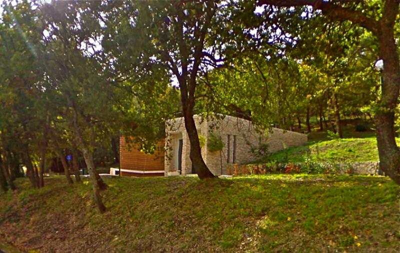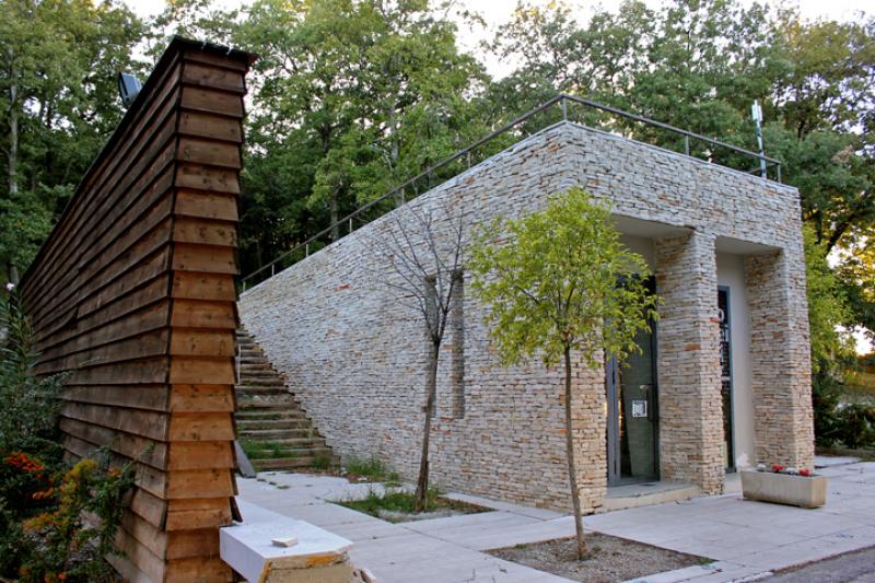 L’intervento prevede una struttura per ospitare alcuni servizi funzionali alla fruizione del parco. Il progetto si articola in tre elementi principali: un volume parallelepipedo, una scala che funge da diaframma, un muro di legno che include un piccolo blocco servizi. Il volume principale, rivestito in pietra a spacco, è inserito in un lotto in pendenza che ne avvolge parzialmente le facciate, lasciando scoperto solo il fronte d’accesso. Alcuni tagli stretti e lunghi, in contrappunto alla trama orizzontale del rivestimento murario, consentono l’ingresso della luce e individuano l’accesso al volume principale. Posta lateralmente, una scala conduce al tetto giardino che si affaccia sul paesaggio e sullo spazio meditativo, delimitato dal setto ligneo, arredato con sedute ed una vasca d'acqua. Le scelte materiche evidenziano la volontà di integrazione con il contesto naturale.