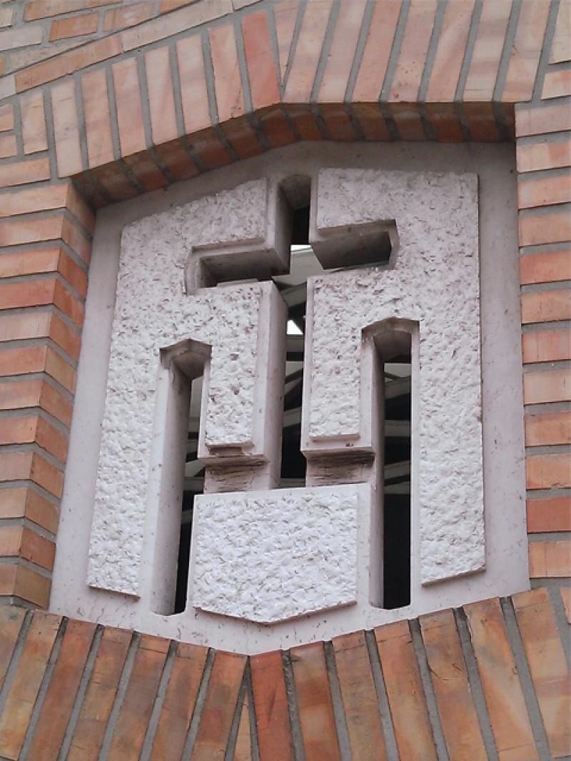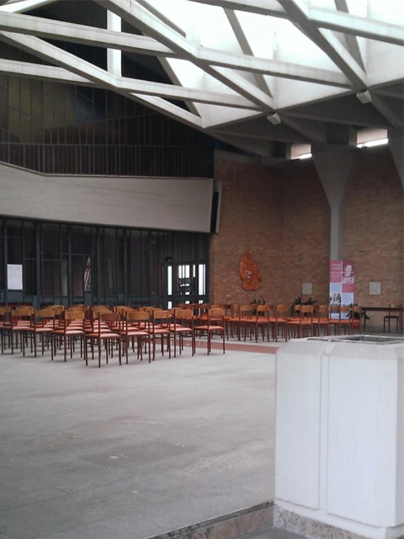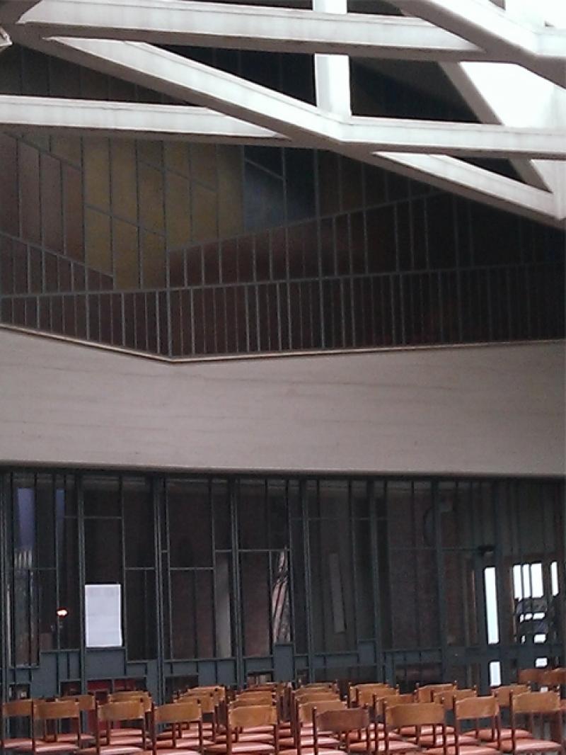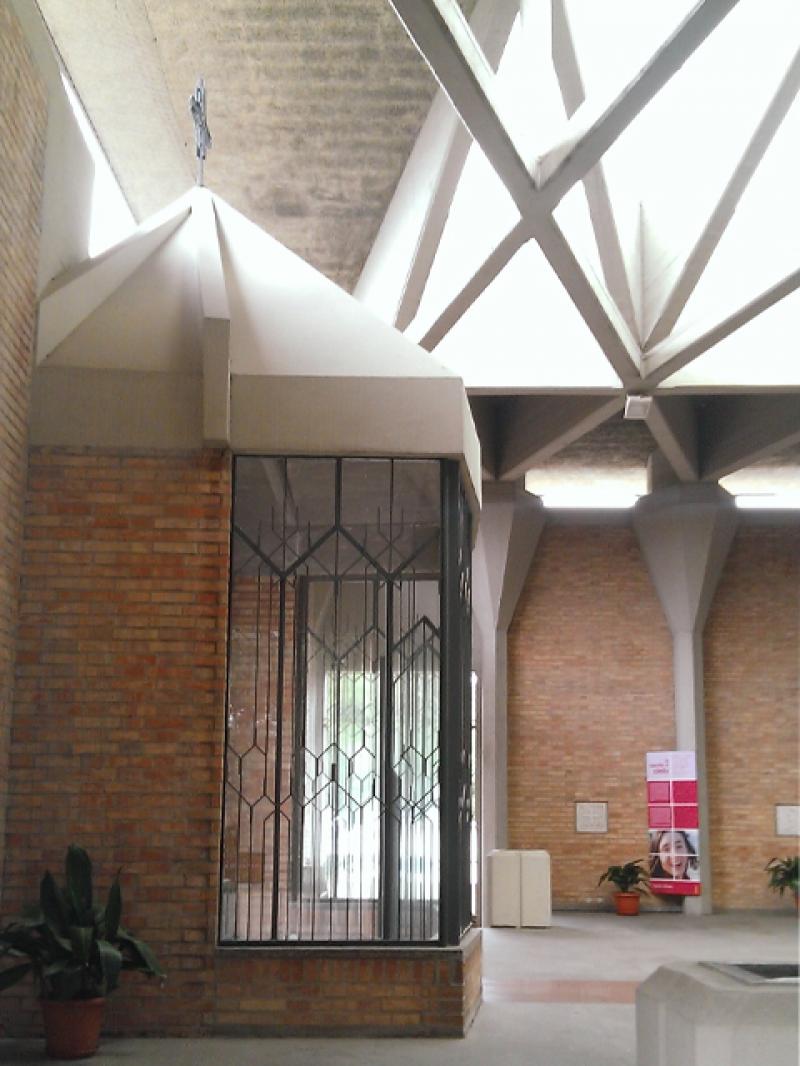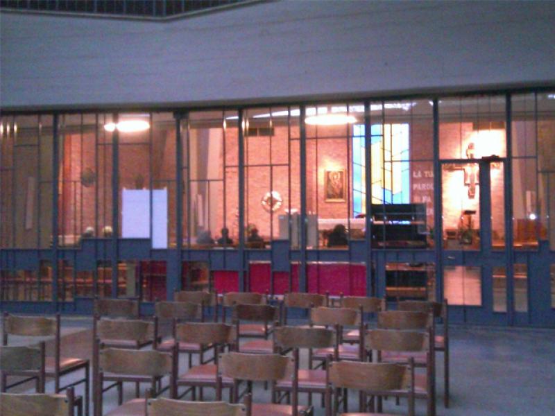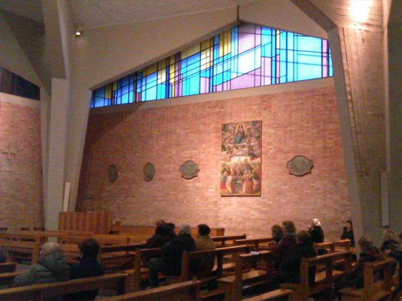 Una vetrata multicolore, progettata dallo stesso architetto, divide i due vani nella fascia superiore della partizione interna e permette di far filtrare la luce. All’interno troviamo quattro pilastri in cemento armato a vista a forma d’albero, non disposti sui quattro lati, ma maggiormente accentrati in modo da attribuire loro una maggiore presenza nello spazio della chiesa. L’aula riceve la luce dalla lanterna posta al centro del soffitto e dalle vetrate colorate che delimitano i tre lati della sala, poste nel punto di contatto tra copertura e pareti verticali. Un ulteriore ambiente sopraelevato rivolto verso l’altare, sopra l’inferriata che divide i due spazi, contiene un maestoso organo.