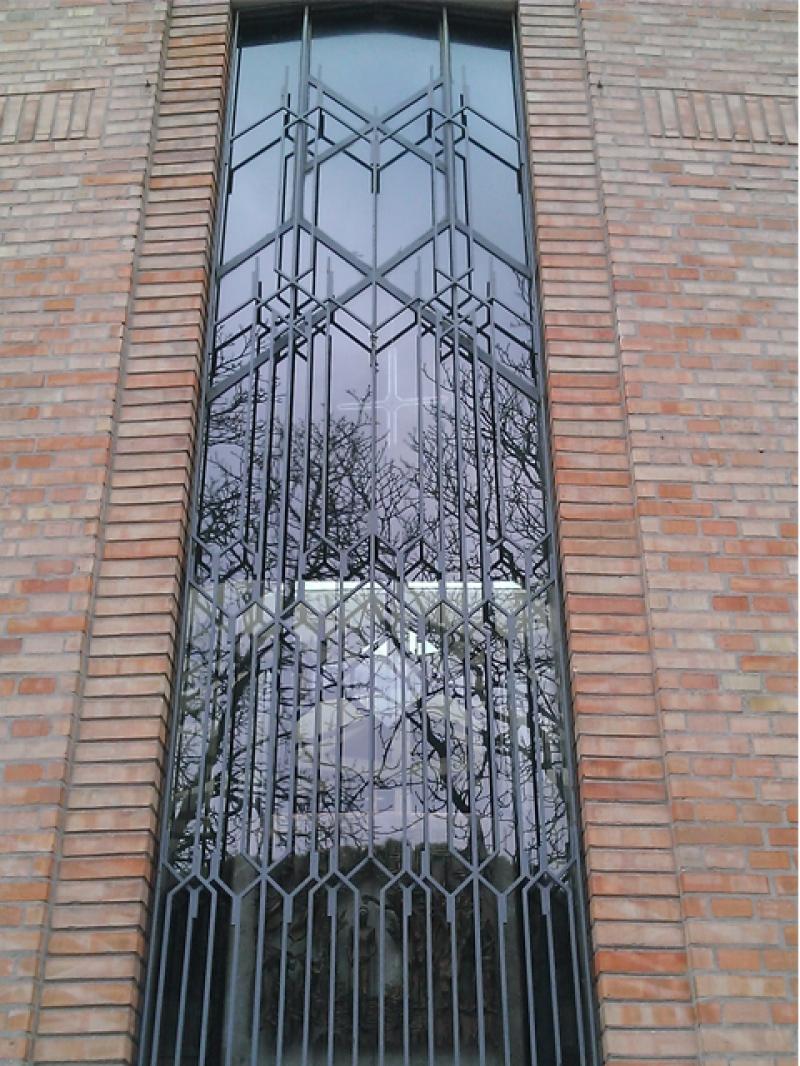 Le facciate sono quasi prive di aperture: l’unica finestra è quella che fa da asse di simmetria alla facciata principale; asse che prosegue internamente nel “tappeto” rosso disegnato nella pavimentazione interna in lastre di pietra. I volumi sono definiti dal rigore geometrico delle superficie, conferito da un tradizionale rivestimento in mattoni la cui semplicità riduce l’effetto monumentale dell’impianto simmetrico e della composizione acropolica che interessa l’intero edificio.