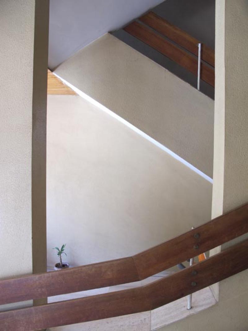 La facciata rivolta verso l’adiacente edificio, il cui distacco produce un giardino raccolto, risulta, al contrario, per scavo della medesima volumetria, in cui le logge e i pannelli in vetro dei parapetti producono la sensazione di un corpo modellato nell’intonaco, il cui colore rosso intenso riprende, se visto dal lato delle mura medioevali, una cromia padana antica".