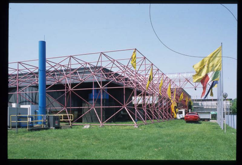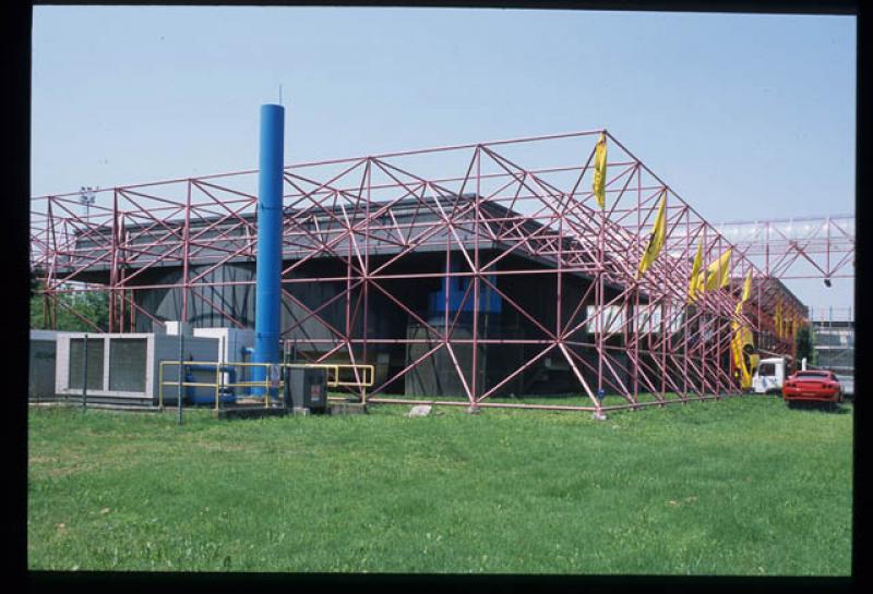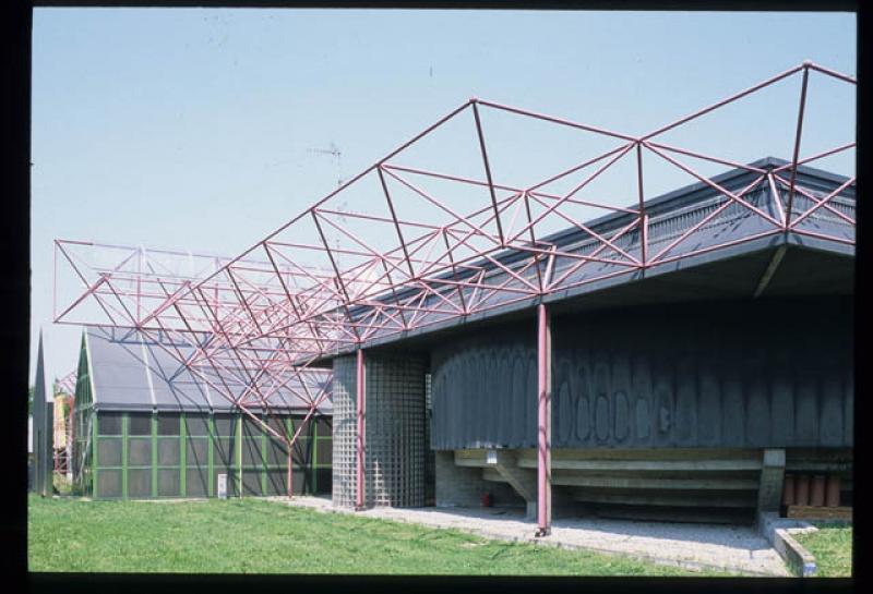 L’edificio si compone di un traliccio metallico tridimensionale, realizzato mediante tubi “Mero”, che sostiene la copertura in alluminio. La struttura comunica un effetto di forte astrazione. È come se definisse uno “spazio” primario, in cui il tamponamento svanisce per far prevalere l'"immagine" del giunto e dell’elemento componibile. All’interno di questo si rende visibile il volume cilindrico in pannelli d’acciaio che ospita la sala a gradoni destinata agli eventi culturali. Quest'ultimo spazio è anticipato dalla parete d’ingresso anch’essa curvilinea e in vetrocemento.