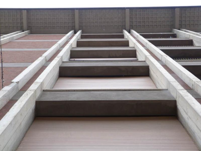 In risposta alla necessità di risolvere l’aspetto figurativo, l’architetto si serve di un’intelaiatura a trama fine di cemento e suggerisce attraverso di essa, un ritmo che dialoga con le pannellature alternate ai vuoti della loggia.
