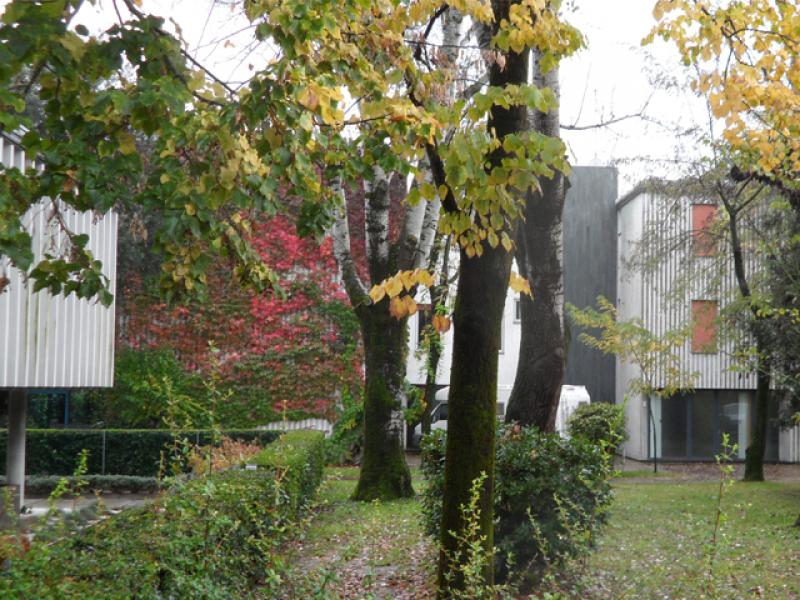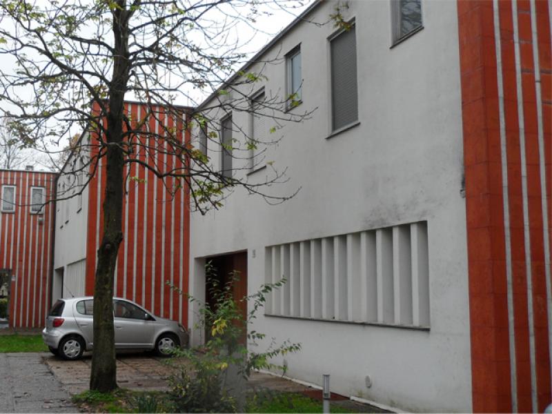 La condizione di “vuoto” che caratterizza il luogo, è quanto Monti utilizza per fondare il progetto delle nuove residenze, organizzate planimetricamente secondo un principio di ricomposizione di frammenti. Le abitazioni sembrano sparse in un grande parco a cui si accede da tutti i blocchi, collegati tra loro da percorsi realizzati in lastre di pietra. Il tutto è fluido e permeabile, favorito dall’assenza di recinzioni tra un corpo e l’altro. Il movimento dei percorsi di attraversamento asseconda il dinamismo della composizione.