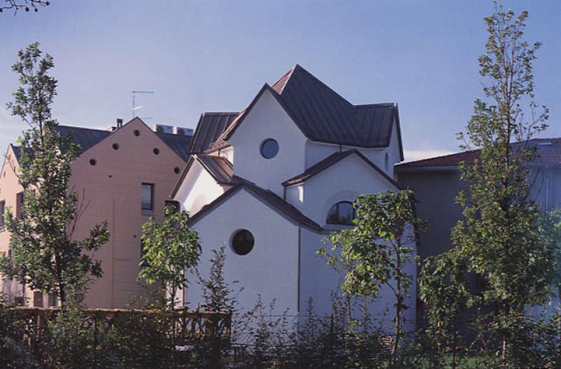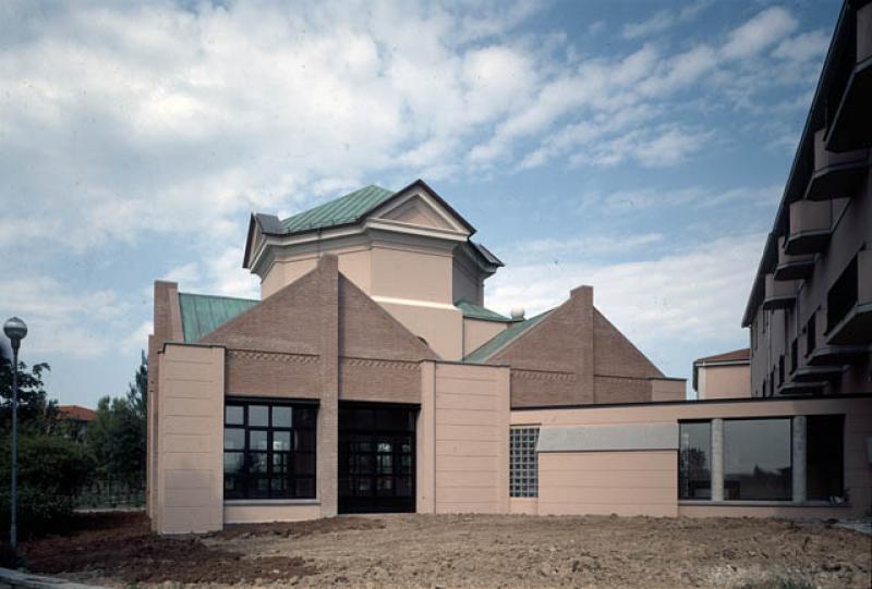 Il complesso punta, infatti, a inserirsi nel paesaggio della pianura, come vera e propria “emergenza ambientale” (Maretto, p. 81), all’interno dell’urbanizzazione diffusa. Tale obbiettivo è perseguito attraverso forme autonome e al tempo stesso in relazione tra loro. Il corpo della mensa trova in processi geometrici semplici, le proprie forme, tutte impostate sulla figura del quadrato, che detta il modulo e regola gli spazi interni. Il fronte presenta il profilo “consueto” della casa, nell’accostamento di un doppio prospetto coperto da tetti a due acque. L’impaginato delle finestre, inserisce un carattere di modernità in questa forma rigorosa e universale, attraverso l’utilizzo di aperture di diverse dimensioni, a volte allineate, a volte fuori asse. In contrasto con la neutra cromia del rivestimento di questo volume, si pone il corpo dell’oratorio, dialetticamente contrapposto al primo, anche per la presenza materica e l’accentuazione plastica e per la giacitura, impostata sulla rotazione a 45°. Torna qui, nuovamente, il processo geometrico, visibile anche nella conformazione del volume dell’Oratorio, affidata, questa volta, alla figura dell’esagono, ruotato e sovrapposto, a creare un movimento ascensionale, memoria della tradizione costruttiva dei tiburi dei battisteri romanici (da sempre riferimento per l’architetto che dalla sua casa ammira quello della piazza di Parma).