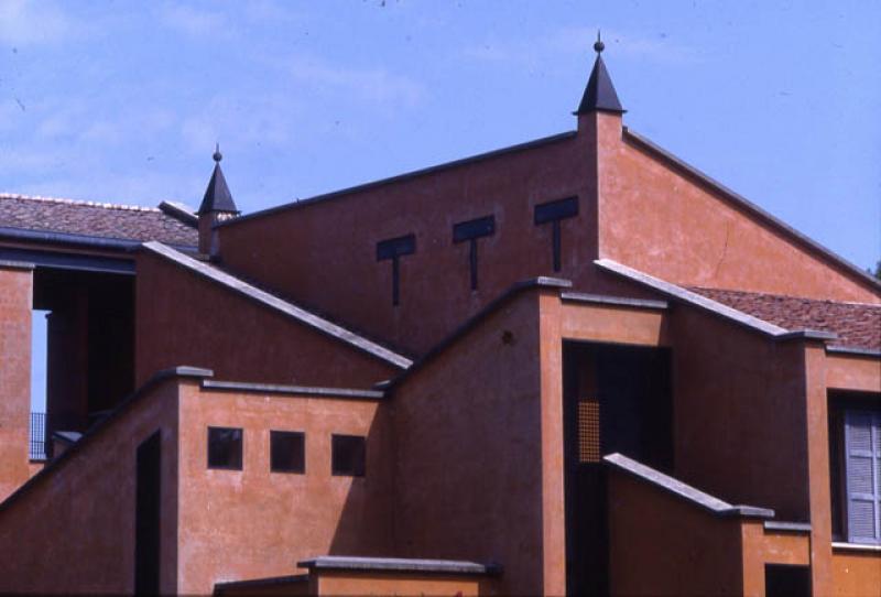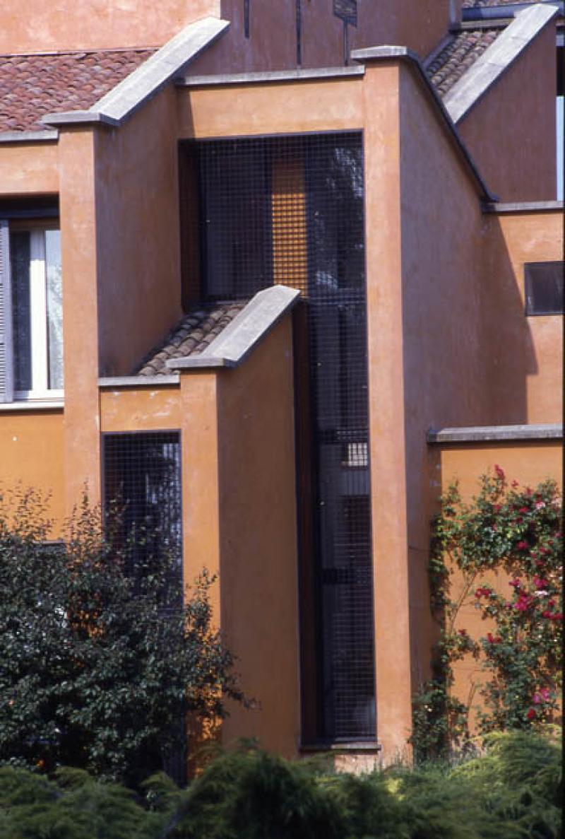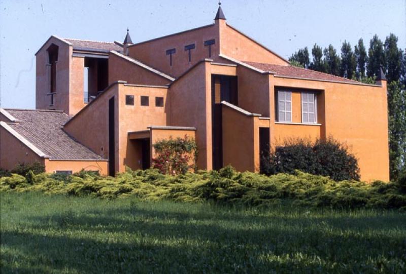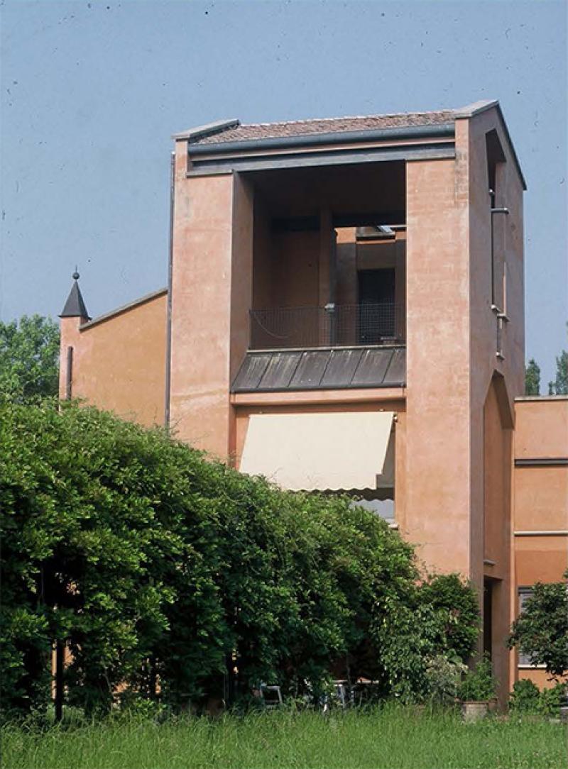 Cresce, dunque per parti l’eclettico edificio e riproduce un disegno versatile, atto a ricordare, nel gioco scherzoso del comporre, (l’aggiungere e il togliere parti della fabbrica, con citazioni allusive ai dettagli dei maestri). E ancora, attendere, con il trascorrere del tempo che muta con le condizioni, e le funzioni dell’organismo progettato. Il tutto con un tratto naturalistico che esalta il ruolo centrale della muratura che emerge a sostegno delle strutture dei volumi franti: -la zona nord- che si completano nel torrione aperto verso i filari di pioppi che cintano la residenza.