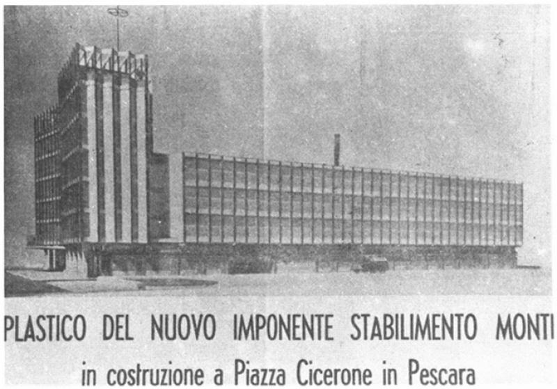 Occupa l’intero isolato prospiciente il MediaMuseum, definendo così una delle quinte prospettiche di piazza Alessandrini. La vicenda costruttiva di palazzo Monti rientra nel novero dei numerosi interventi edilizi avviati nel ventennio successivo alla redazione del piano di ricostruzione di Luigi Piccinato del 1947, il larga parte inapplicato. La destinazione a verde pubblico di numerose aree ricomprese tra la ferrovia e il mare, muta, infatti, in edilizia intensiva dopo la redazione del piano regolatore del 1956. Rientrano tra queste quelle cedute dal marchese Farina agli industriali Vincenzo ed Attilio Monti per la costruzione del loro stabilimento. L’ex-fabbrica Monti in piazza Alessandrini è progettata nel 1954 dall’architetto Cataldi Madonna, il più prolifico di questi decenni: il progetto viene realizzato su parte del sito occupato precedentemente dalla villa e dal parco Farina. Il fabbricato é composto della parte della fabbrica vera e propria, più bassa e collocata posteriormente, con accesso dalla strada laterale, e della parte anteriore di otto piani che guarda verso la piazza dove sorge oggi il Tribunale, anch’esso in via di dismissione. La parte svettante è caratterizzata dalla curvatura della facciata ‘a colpo di vento’, peraltro disegnata da un reticolo molto regolare di finestre con pannello sottostante colorato: alla sommità la griglia si apre agli estremi a definire una sorta di pergola che accompagna la forma a fisarmonica dell'intero pacchetto edilizio. L'attacco a terra è definito dal portico costituito dai pilastri del sistema strutturale. Il progetto redatto dall’architetto Antonio Cataldi Madonna si distingue per la ricercata soluzione formale neoespressionista del lungo fronte flesso del corpo anteriore che contraddice la rigida ortogonalità della cortina edilizia circostante anche attraverso l’attacco a terra porticato. Un reticolo regolare in cemento armato caratterizza l’impaginato del corpo principale; la griglia tamponata da pannelli colorati nel fronte curvo si apre in sommità e agli estremi definendo il gioco di luci e ombre dei prospetti laterali.