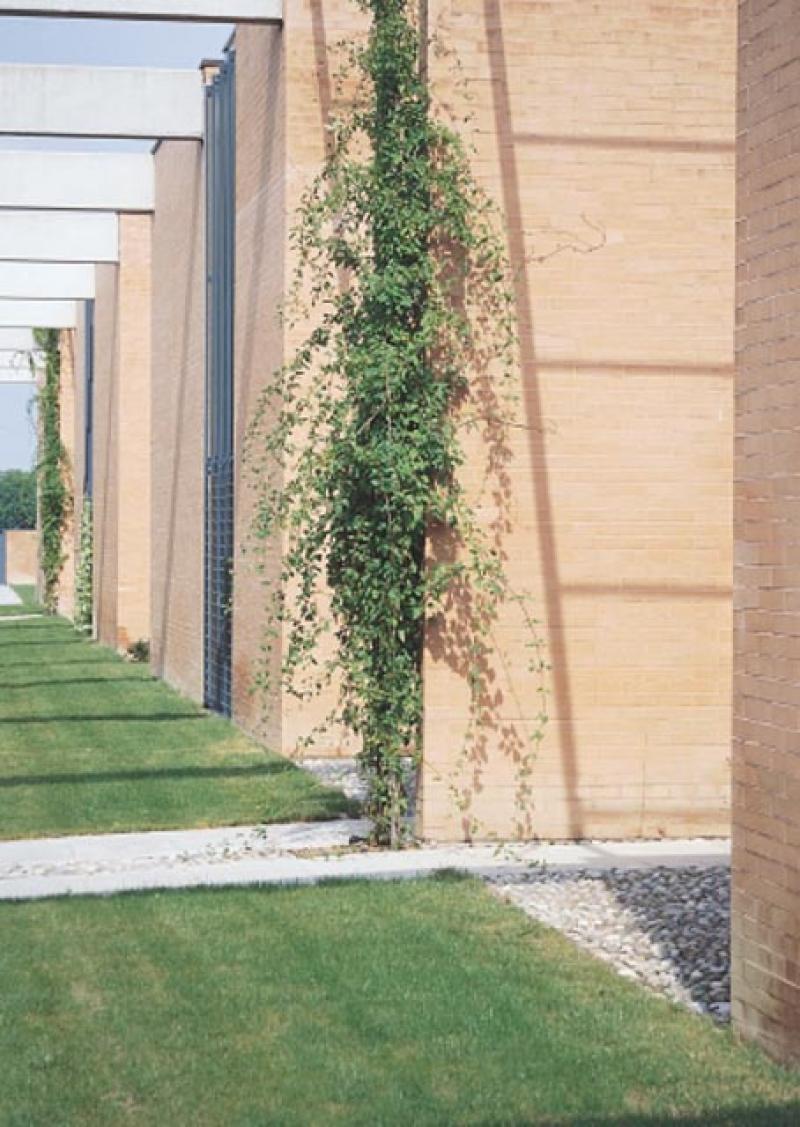 Il tema del muro si sviluppa anche all’interno: da “recinto” diventa filtro con l’esterno. I fronti dei soggiorni verso il giardino, infatti, sono mediati da setti alti come le case e spessi venti centimetri, rivestiti di listelli di mattoni segati.