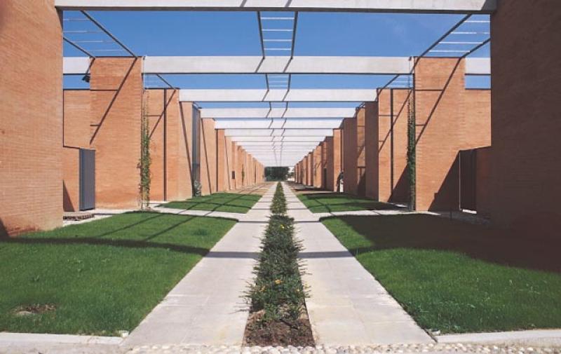 Le otto unità abitative si dispongono a “insula”, le une accanto alle altre in due file di quattro appartamenti unifamiliari ciascuna. Il complesso è chiuso all’esterno da muri in cemento armato alti due metri, lisci e coperti da rampicanti che definiscono in modo chiaro il confine del costruito, negando ogni relazione con la crescita urbana circostante, ponendosi, anzi, come organismo autoreferenziale.