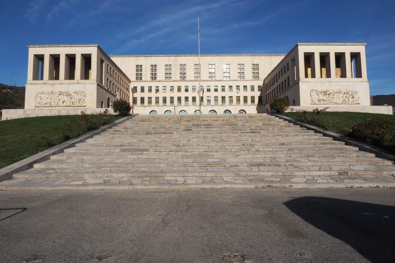 A partire dal primo marcapiano gli spessori si riducono notevolmente, grazie all’impiego di mattoni pieni, che favoriscono inoltre una più rapida esecuzione. Considerate le buone caratteristiche di resistenza del terreno costituito da flysch con strati di arenaria di spessore variabile, sono state previste fondazioni continue di calcestruzzo. Soltanto per gli ambienti del piano seminterrato, per il porticato del corpo centrale e per i due piazzali principali è stato progettato un sottofondo in pietrame con sovrastante platea di calcestruzzo. Nella parte delle ali prospiciente il piazzale, in corrispondenza dei porticati, la muratura è sostenuta da arcate. Nel corpo centrale, dove il progetto del 1938 prevede un sistema ad archi che rappresenta la sola struttura portante esistente: l’impalcato del piano primo è costituito da volte a vela in calcestruzzo poggianti su pilastri, disposti in base ad una maglia quadrata 6 x 6 m. In fase di esecuzione la tecnologia costruttiva fu modificata: nel corpo centrale i pilastri furono realizzati con mattoni pieni ad una testa e riempimento in calcestruzzo, mentre le volte con mattoni in foglio. Quindi alle volte fu assegnata soltanto una funzione estetica, non più quella strutturale prevista inizialmente. L’aspetto desiderato è assicurato, ma associato erroneamente alla massa muraria mentre in realtà è reso possibile grazie all’impiego del telaio in cemento armato. Seppur anche nell’Edificio Centrale il risultato sia analogo, a differenza di altri casi (es. Palazzo della Civiltà Italiana), le volte non sono autoportanti ma appese al solaio del piano primo. La muratura, ove non supportata dai porticati, è appoggiata direttamente sui solai mediante la realizzazione di cordoli: in generale è prevalsa infatti l’impostazione di non progettare travi, ma soltanto rinforzi eseguiti allargando le nervature e prevedendo una armatura aggiuntiva.