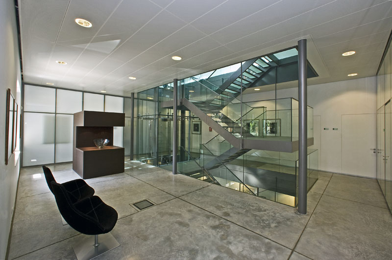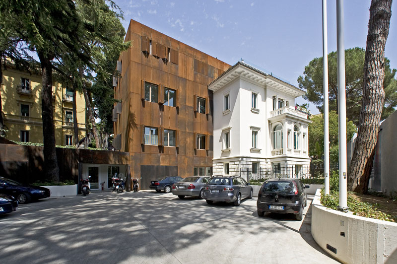 Il progetto di ristrutturazione dell’Ambasciata d’Olanda ha comportato una radicale trasformazione della vecchia sede, collocata in un villino della fine degli anni Venti, al fine di operare un intervento di riorganizzazione funzionale e di riconfigurazione architettonica della struttura originaria. Il progetto è costruito sul forte contrasto tra le due parti del manufatto: l’involucro del villino originario è stato oggetto di un accurato restauro conservativo, mentre l’interno è stato demolito e riorganizzato; analogamente il corpo aggiunto è stato completamente ristrutturato dopo essere stato ridotto al puro involucro strutturale. La parte più recente è interamente rivestita con pannelli in acciaio corten, in contrasto con quella antica intonacata in color avorio; al contrario di quanto accade all’esterno, gli spazi interni sono disegnati in maniera unitaria intorno ad un pozzo di luce illuminato dall’alto che contiene i collegamenti verticali.