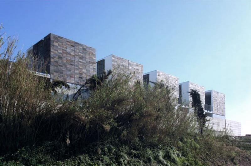 Nell'obiettivo di stabilire una forte relazione con il paesaggio i volumi sono stati concepiti come blocchi compatti da cui sono state tagliate delle porzioni: la parte esterna è rivestita in pietra, la “superficie di sezione” è di intonaco bianco. I corpi sono attraversati e collegati da percorsi che permettono, tra un volume e l’altro, di apprezzare il paesaggio; allo stesso scopo la recinzione non è un elemento continuo: le mura perimetrali sono infatti costituite da scaglie tra le quali si inquadrano scorci di paesaggio.