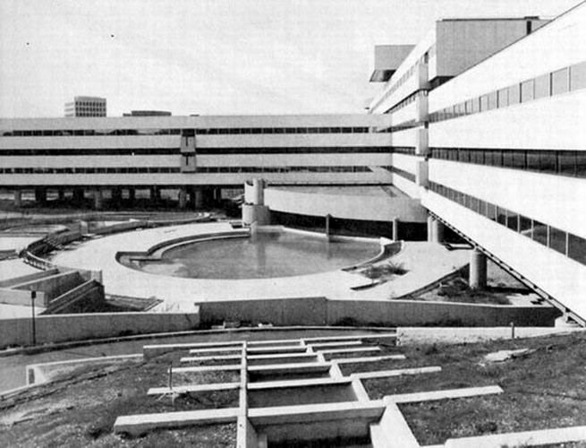 L’idea di base si fonda sulla realizzazione di una planimetria a pianta cruciforme, richiesta dalla committenza, che si differenzia nelle dimensioni dei bracci e del numero di piani. Grazie all'impiego di sottili fasce di finestre a nastro alternato a quelle specchianti chiare a filo con la facciata, e quelle assorbenti scure e arretrate, è stato possibile ridurre visivamente il numero di piani. Il progetto degli esterni si compone di un sistema di forma circolare, formato da una piscina e da una serie di gradonate, il quale inserisce l’intero complesso nella viabilità perimetrale esterna.