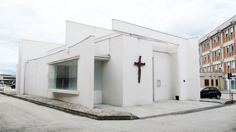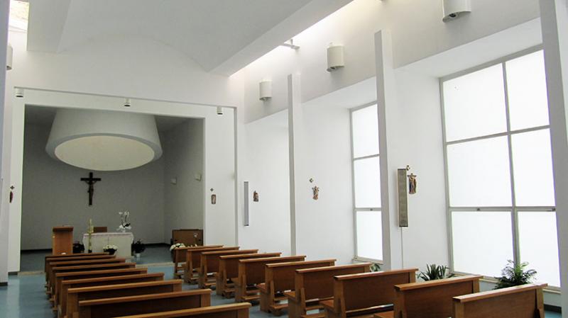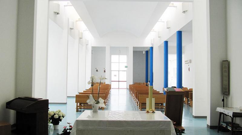 Il piano di calpestio e la copertura, lievemente inclinati, conducono attraverso la navata scandita dalle grandi vetrate inserite tra i setti murari da un lato e le essenziali colonne dipinte di blu dall’altro. La longitudinalità dell’impianto è sottolineata dalle lame di luce che tagliano il solaio fino al transetto in cui lo spazio si dilata verticalmente accogliendo un tronco di cono che convoglia la luce naturale direttamente sull’altare. La struttura in setti e travi in calcestruzzo armato, interamente intonacata di bianco, si distingue per la purezza delle linee e delle superfici che caratterizza interno ed esterno dell’edificio.