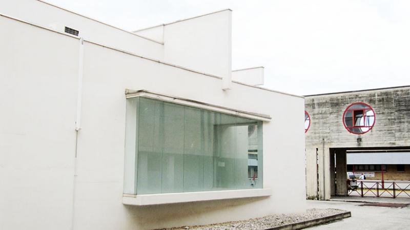 Il volume a un unico livello è qualificato dal forte dinamismo ottenuto attraverso l’intersezione di setti verticali e pareti curve ritagliati da asole vetrate.