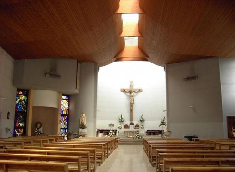 La forma planimetrica dell’aula è trapezoidale con il lato corto dalla parte dell’ingresso (vestibolo) al quale si accede tramite un pronao con una gradinata collegata all'antistante sagrato. L’aula, si conclude con un abside semicircolare. L’altezza è crescente dall'ingresso all'abside. La struttura portante dell’edificio è in cemento armato con pareti esterne in cemento a faccia vista rappresentativa di un certo tipo di architettura all'epoca. La copertura del complesso è in capriate in legno lamellare con motivo crescente verso l’abside e sfalsate tra di loro ad intervalli regolari; le suddette capriate presentano una fincatura centrale longitudinale, sottolineata da due travoni inclinati che seguono la pendenza della copertura e incorporano un’asola di luce per l’illuminazione dall'alto.