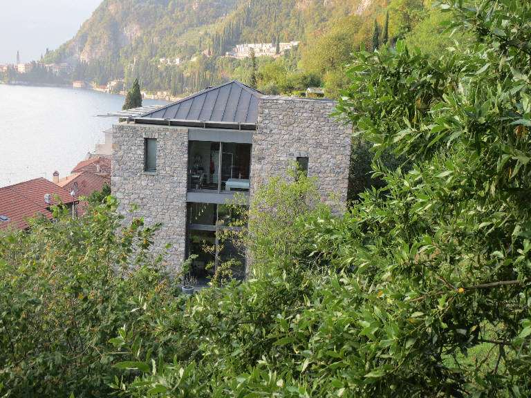 A fronte di tanta assonanza con il luogo e con un selezionato carattere nella tradizione costruttiva lacustre, la falda in vetro della copertura, che sporge con andamento inverso rispetto all'usuale (verso l'alto invece che verso il basso) e le ampie vetrate sapientemente distribuite sui quattro lati della casa, introducono il riferimento a un'estetica tecnologica di grande effetto, che conferma una padronanza tutta "comacina" nell'innovare la tradizione con una modernità colta e originale.