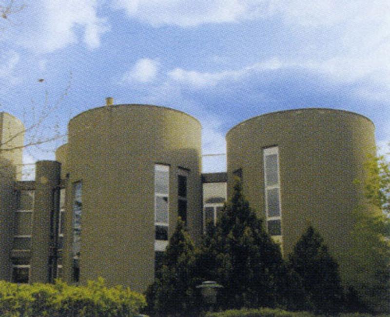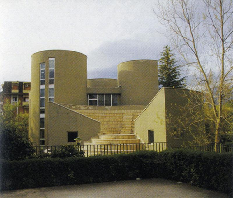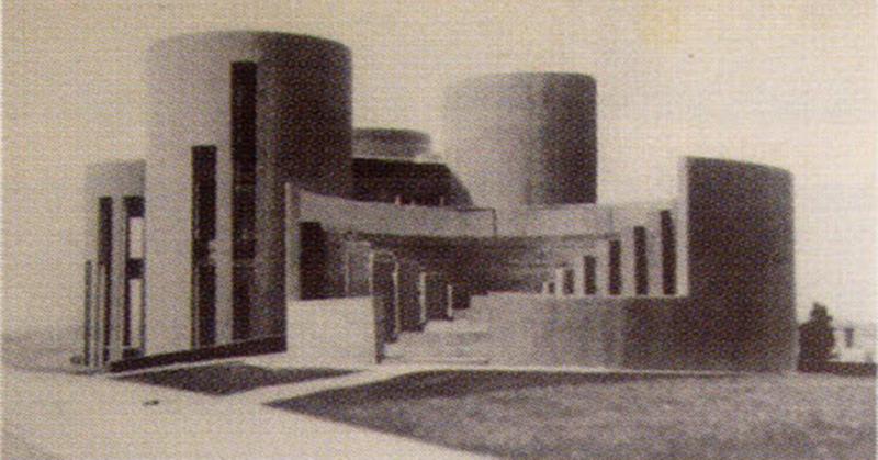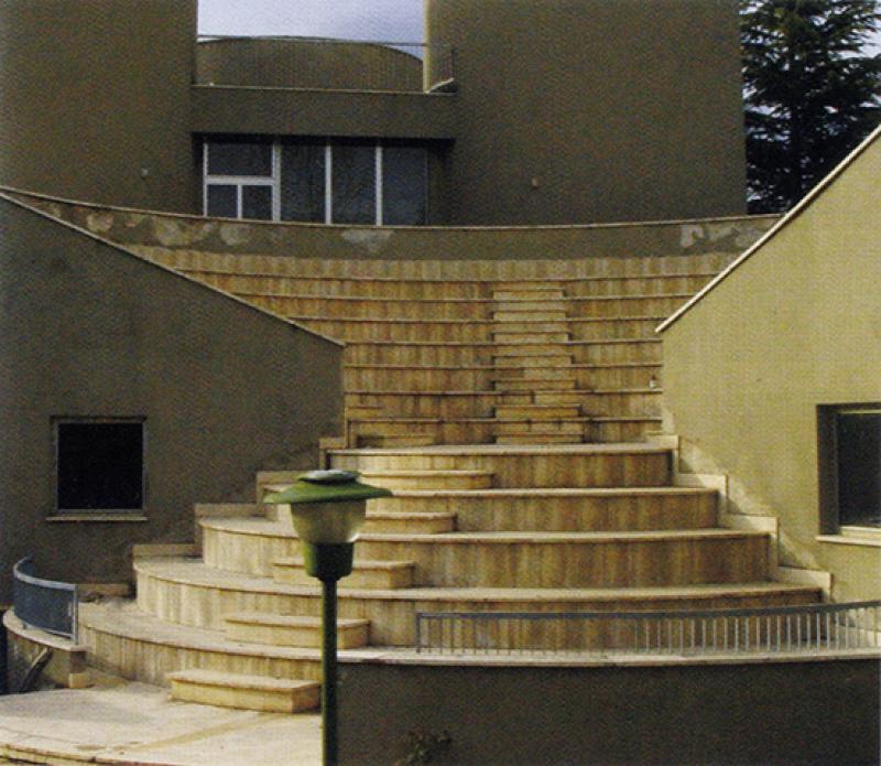 La struttura laterocementizia conformata in volumi e superfici plastiche è frutto del sodalizio professionale tra l’arch. Paolo Portoghesi e l’ing. Vittorio Gigliotti che, iniziato nel 1964, produrrà in oltre trent’anni di collaborazione interessanti sperimentazioni sull’uso della linea curva per la creazione e modellazione dei rapporti architettonici spaziali legati a suggestioni barocche come la casa Andreis a Scandriglia (Rieti, 1965) e la chiesa della Sacra Famiglia a Salerno (1969-75). La ricerca di un forte legame tra il manufatto e il paesaggio circostante si coglie ancora, nonostante la recente congestione urbana, attraversando la cavea dell’area polifunzionale esterna che inquadra l’imponente profilo del monte Morrone.