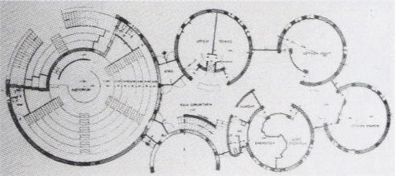 Il Centro Servizi Culturali di Sulmona, sede della biblioteca “Giuseppe Capograssi”, sorge nell’area di espansione est della città collegata al centro storico nel 1962 con l’omonimo ponte costruito sul torrente Vella. La saturazione edilizia del contesto rende complessa la lettura della fabbrica concepita come un organismo frutto dell’accostamento di corpi cilindrici e segmenti curvilinei disegnati su un “sistema di centri”.