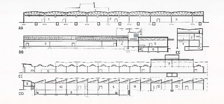 La planimetria dell'insediamento è composta da numerosi padiglioni, raccordati da una galleria coperta di distribuzione che separa la parte produttiva vera e propria dalle aree destinate a magazzini, officina meccanica e servizi ausiliari. L'asse distributivo è concluso, in prossimità dell'ingresso, da un corpo di fabbrica destinato a uffici e dalla portineria. Oltre gli ambienti della produzione sono organizzati i servizi, che includono spogliatoi e mensa e che sono raccolti intorno a un patio, abbellito da una vasca d'acqua. Vengono costruite anche una villa per il direttore e una breve schiera di case per i tecnici.