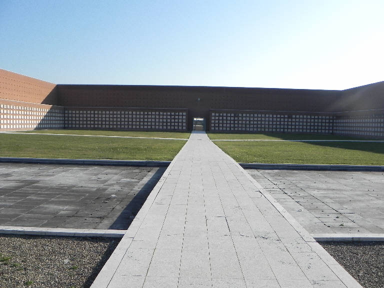Si tratta del quinto intervento di ampliamento rispetto all'originale configurazione del cimitero risalente all'epoca napoleonica. Il progetto si articola attraverso la relazione tra la grande corte dei loculi, orientata ad ovest, l'edificio dell'ossario a Nord, termine ultimo del precedente ampliamento, e il bosco di pioppi cipressini destinato ad accogliere le inumazioni a terra. La nuova corte svolge anche la funzione di atrio dell'intero complesso cimiteriale, in aggiunta, e non in sostituzione, dell'ingresso storico posto a sud. I tre lati della corte sono composti da due volumi di altezze diverse: quello più basso, che contiene i loculi, sporge rispetto a quello più alto creando due piani, uno più avanzato dell'altro. In questo modo i tre lati della corte sono maggiormente definiti dai corpi più bassi e più avanzati in cui si incastrano mille lapidi in pietra bianca di Vicenza. I tre lati della corte sono definiti da uno specchio d'acqua che scorrendo lentamente intorno ad un prato centrale definisce un'isola, alla quale si accede attraverso percorsi obbligati che superano la grande vasca d'acqua. Attraverso la corte è possibile accedere al cimitero storico dalla porta est, al più recente ampliamento passando dall'ossario e dalle porte Nord e Sud si giunge ai campi di inumazione immersi nel bosco di pioppi.