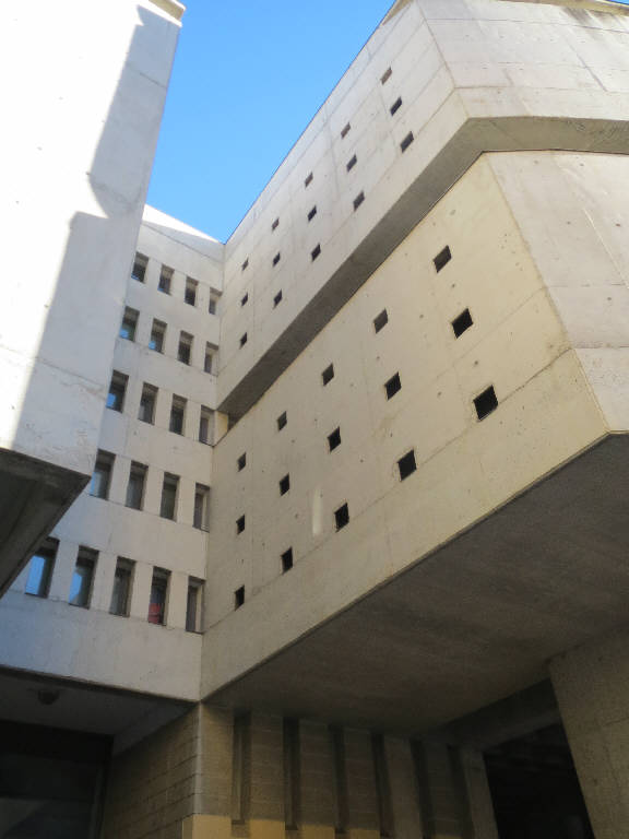 La compattezza monolitica del complesso è rotta solo nel corpo rivolto ad est, con facciata vetrata e brise soleil verticali in cemento.