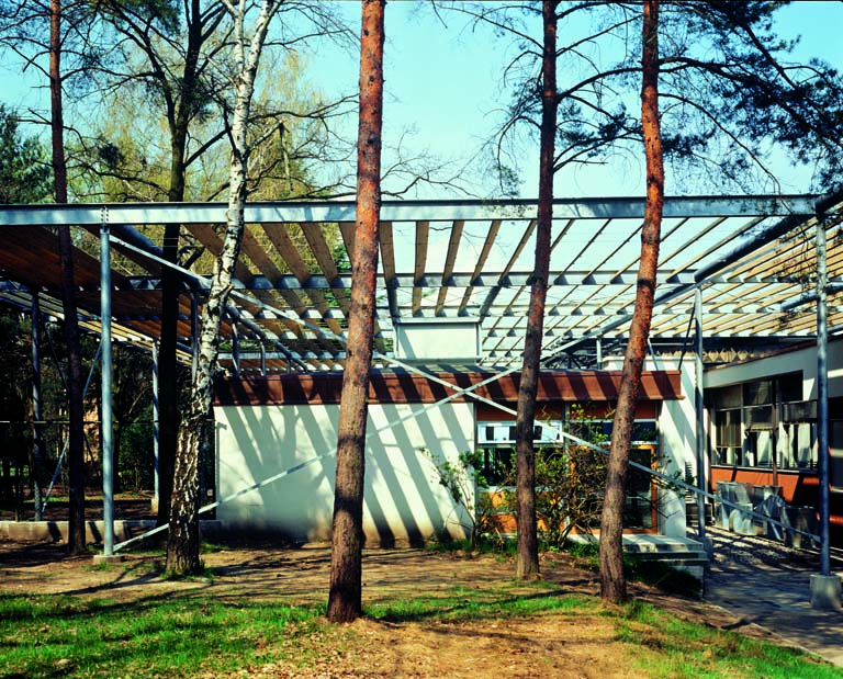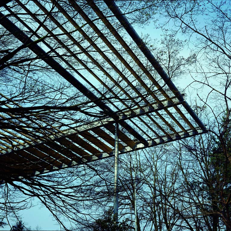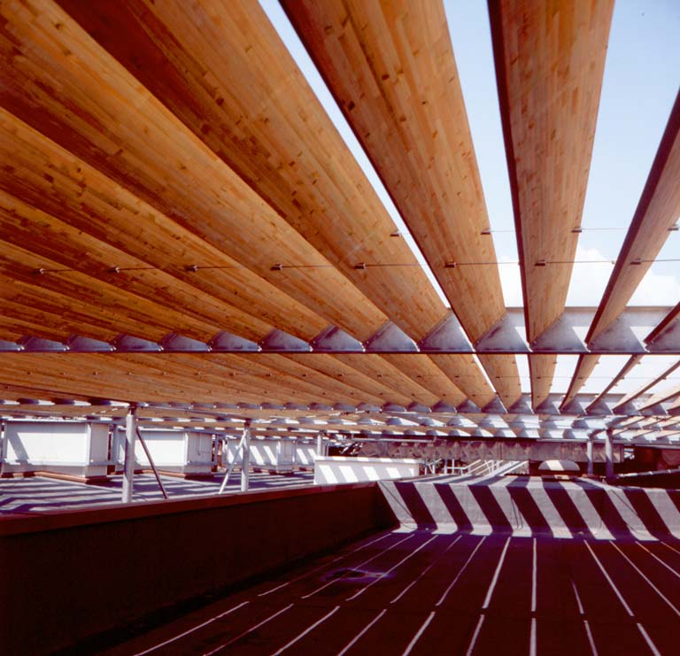 La copertura è infatti costituita da una serie di travi e pilastri in acciaio zincato a cui sono agganciate lamelle in legno d'acero rosso che coprono una superficie totale di oltre cinquemila metri quadri e sono variamente inclinabili, in funzione della quantità di luce naturale e calore richiesti dagli spazi sottostanti. Fin dall'inizio i progettisti hanno previsto che parte della struttura sarebbe stata coperta da vegetazione rampicante, che modifica la percezione degli ambienti anche in funzione delle stagioni.