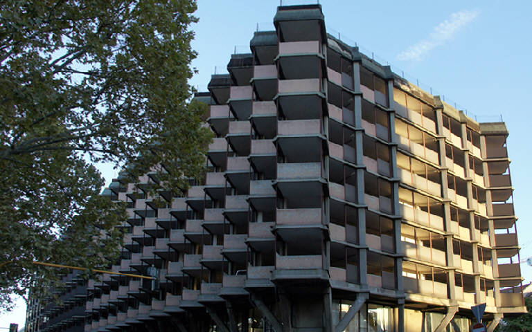 Il grande edificio di otto piani, più tre interrarti, occupa in lunghezza il lotto rettangolare sorto sul sedime delle antiche mura venete, abbattute nell'800 per fare posto alle nuove arterie viarie di attraversamento della città.