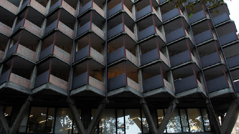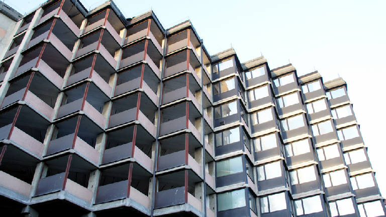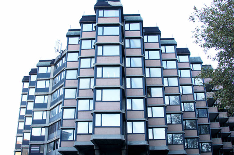 La collocazione delle file dei posti auto, inclinate a 45°, ha determinato la composizione dei fronti principali, caratterizzati dal profilo seghettato dei sei piani, in origine destinati tutti ad autorimessa.