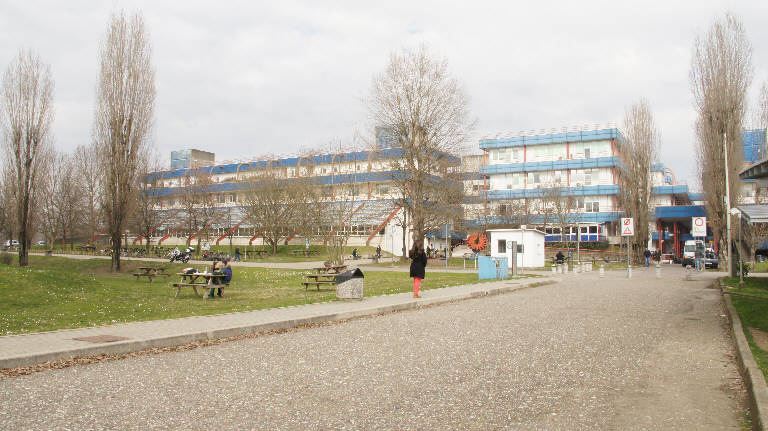 L'edificazione è organizzata mediante una griglia modulare maggiore, ai cui incroci sono collocati i sistemi di distribuzione verticali, e da una griglia modulare minore che coincide con il passo della struttura portante degli edifici. I blocchi principali sono costituiti ciascuno da due corpi di fabbrica paralleli, a piani sfalsati di mezzo livello, collegati nelle testate e separati da uno spazio centrale aperto e a verde. I primi due piani sono caratterizzati da una grande vetrata inclinata che individua uno spazio a doppia altezza. La struttura principale è in acciaio a vista, il rivestimento in pannelli di acciaio porcellanato. Le rampe di accesso avrebbero dovuto costituire un percorso in quota di collegamento tra i blocchi. Il complesso e le successive realizzazioni sono stati eseguiti difformemente dal progetto.