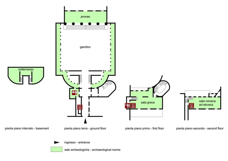 Due rampe di scale a cielo aperto conducono a una sala ipogea che ricalca nella pianta quella dell'esedra superiore. Illuminata da lucernari aperti nel cortile soprastante, e caratterizzata da muri intonacati e dalla soletta in calcestruzzo armato faccia a vista. Altre sale interne sono allestite ai piani primo (sala greca) e secondo (sala etrusca e romana) del corpo di fabbrica est, al di sopra dell'ingresso e affacciato sul tratto iniziale di Corso di Porta Nuova. Anche in questo caso Rudi disegna dei supporti per i reperti piuttosto semplici, con elementi portanti in profilati metallici a doppio "T" e pannelli dal colore neutro.