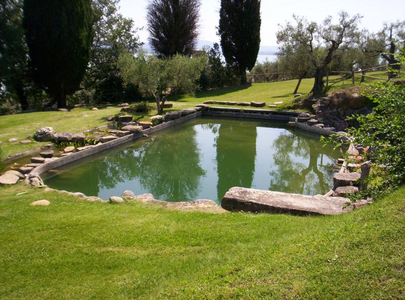 La realizzazione si distingue di fatto in due ambiti separati: il primo è rappresentato dal “giardino”, che comprende la zona di approdo, un viale piantumato di accesso e la zona seminata a prato che si estende dalla villa alla foresteria; il secondo è costituito da un’area molto estesa situata su un declivio piantumato a oliveti e dalla “piscina”, articolata in tre fasce poste su tre livelli altimetrici differenti. Alla prima fascia, posta più in basso e a forma di “L” allungata, si accede per mezzo di una scalinata posta a ridosso di un terrapieno di contenimento della collina artificiale, appositamente realizzata per ospitare i volumi del magazzino, degli spogliatoi e l’impianto di depurazione; la fascia centrale, il cui ingresso è sottolineato dalla presenza di cipressi di grandi dimensioni, è costituita dal piano terrazzato che circonda la piscina e dalle vasche laterali su cui si trova la grande varietà di piante acquatiche inserite; la terza fascia è costituita da un semicerchio che si allarga attorno alla scarpata che sovrasta la vasca della piscina ed è caratterizzata dalla presenza di olivi. La zona della “piscina” si colloca in posizione rialzata rispetto al giardino, protetta da un terrapieno che non la rende visibile dalla strada che la costeggia, e si affaccia sulla zona sud-est del lago Trasimeno.