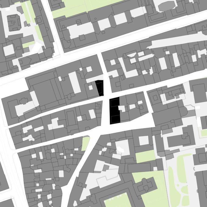 Entrambi i fabbricati usano il medesimo linguaggio materico, giocato sulla bicromia: al rivestimento in lastre di granito per il piano terra, viene contrapposto un intonaco color panna.