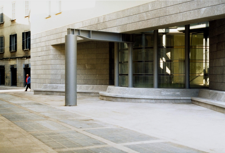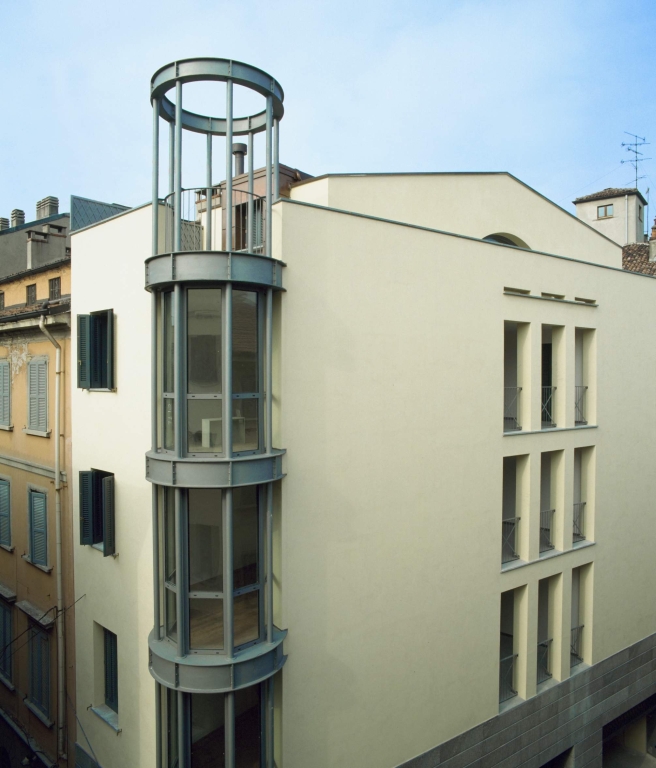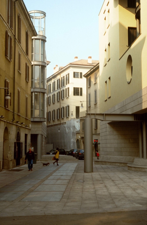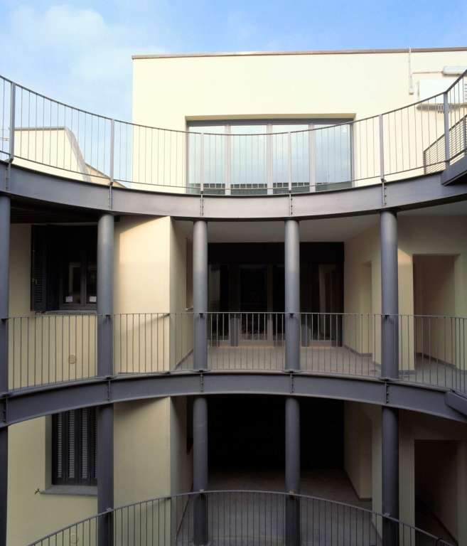 L'intervento si compone di due edifici indipendenti, inseriti nel contesto di un isolato storico del quartiere di Brera - rimasto parzialmente inedificato dopo i bombardamenti del 1943 - che Bellini cerca di ricucire, sia attraverso un attento disegno del piano terra e dei percorsi che lo legano all'intorno, sia mediante il riferimento costante a figure tipologiche come il la corte e il ballatoio. Il corpo di fabbrica su via Madonnina, per esempio, è attestato intorno a un cortile a pianta circolare la cui sagoma è ribadita tanto verso l'interno - con una serrata sequenza di ballatoi in ferro, che si sovrappongono a distribuire le abitazioni ai piani superiori - tanto verso la piccola piazza antistante il complesso, su cui si riflette mediante un improvviso vuoto della facciata, in corrispondenza del secondo e del terzo livello, e gli aggetti di un volume trasparente al piano terra e di un balcone in copertura.