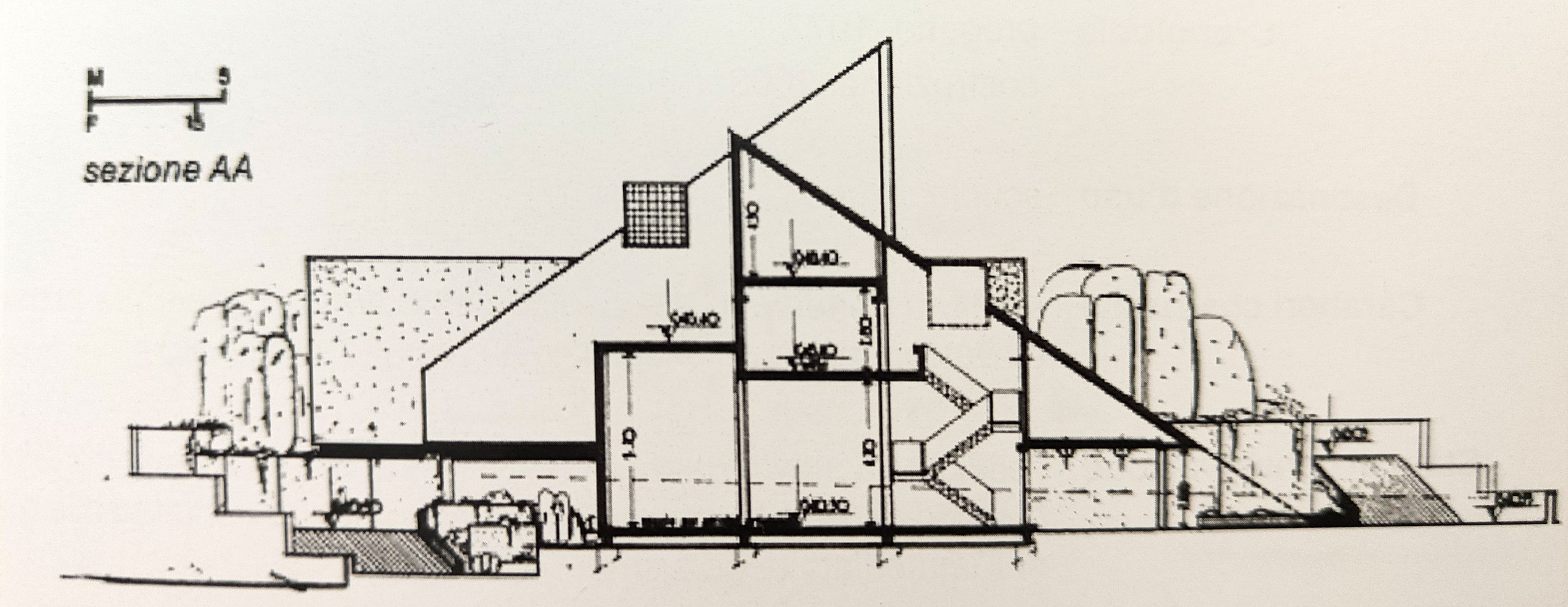 L’edificio progettato per ospitare una serie di laboratori artigianale e un punto commerciale si configura come una composizione di forme geometriche pure. Dei due volumi triangolari principali impostati secondo opposte direttrici risulta realizzato solo quello nord affiancato e intersecato dal cilindro del corpo scala e dal cubo dei laboratori caratterizzati rispettivamente da calcestruzzo a vista e vetrocemento e da intonaco chiaro liscio e uniforme. Al piano terra ogni corpo ospita, quindi, una diversa funzione interna; l’alloggio è ubicato al livello superiore ed è dotato di grandi finestre a nastro e di un terrazzo ricavato in un’asola della copertura utili alla fruizione del paesaggio circostante oggi fortemente alterato dall’espansione edilizia della città.