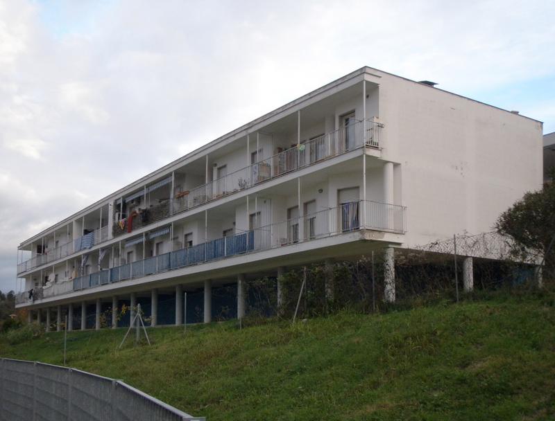 Dodici alloggi popolari di diversa metratura e taglio vengono organizzati all’interno di un volume a due blocchi: uno pieno per abitare, uno vuoto per parcheggiare, passeggiare, conservare le proprie cose e distribuire visitatori e abitanti nelle proprietà allocate nel primo volume. La parte piana, su due livelli, srotola la sua facciata in tante pieghe diverse da piano a piano.