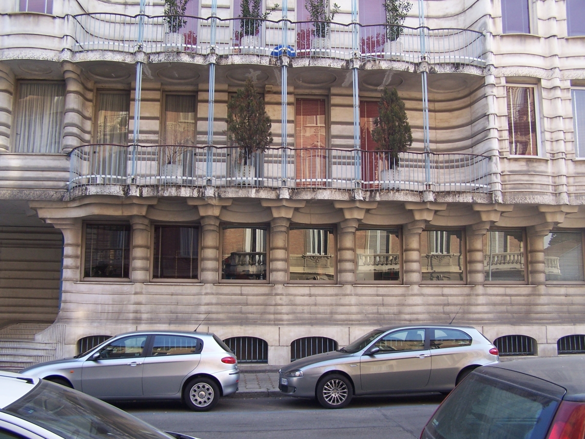 L'edificio residenziale è caratterizzato dai prospetti curvilinei delle facciate, marcatamente scanditi da rilievi orizzontali sovrapposti.