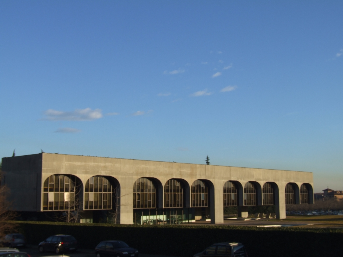 L’edificio, ardito e saldo come un ponte, è un parallelepipedo compatto, stretto e lungo, sollevato dal suolo su tre coppie di possenti pilastri, che ne cadenzano i fronti. L’immagine è quella del lungo fronte principale, ritagliato, come la silhouette di un ponte, da archi ampi e ribassati, tutti con uguale profilo. A sorpresa, alcuni piedritti degli archi sono interrotti in corrispondenza del primo solaio in quota, mentre gli altri scaricano robustamente sul terreno. Il pilastro centrale segna l’asse di simmetria, rispetto al quale, da un lato e dall’altro si aggregano, fino al pilastro successivo, tre archi, mentre altri due archi restano sospesi a sbalzo, disegnando complessivamente un prospetto articolato dal concatenarsi di dieci archi. Due corpi scala, plasticamente modellati nel cemento, si staccano dal volume principale, conquistandogli una potente tridimensionalità spaziale. L’edificio FATA, sgomenta per lo strabiliante effetto di sospensione che lo apparenta a un vero e proprio ponte di terraferma, con sbalzi laterali di ben 21,30 metri, e interassi tra i pilastri di 32,40 metri.