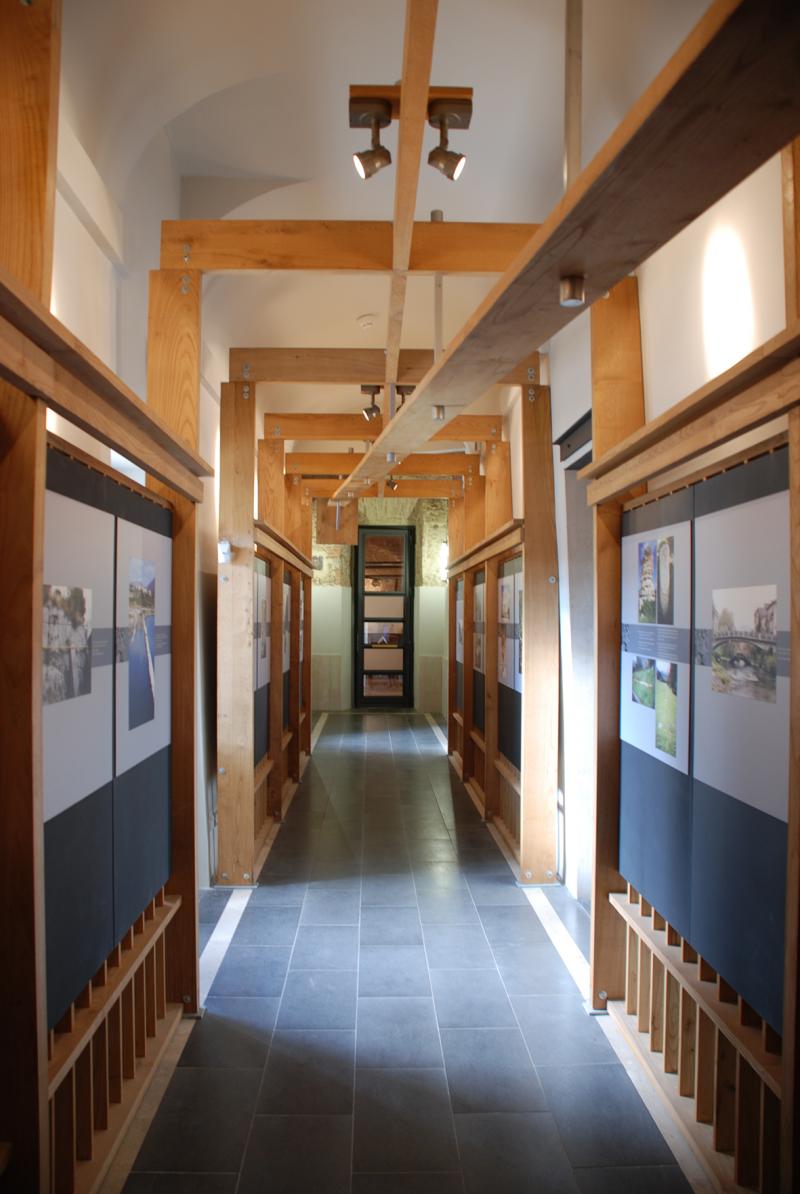 Le sale, in cui sono state riportate in vista, dove possibile, le trame parietali originarie, sono trattate come quinte e scenografie teatrali in cui trovano posto: supporti a carrello scorrevoli su binari che ospitano reperti di grandi dimensioni o sostengono vetrine modulari che possono essere spostate e assemblate in nuove configurazioni; mensole e pannelli metallici a parete per piccole sculture; gabbie a traliccio ligneo che ridefiniscono le stanze o alludono, come nello stretto corridoio, a percorsi viari.