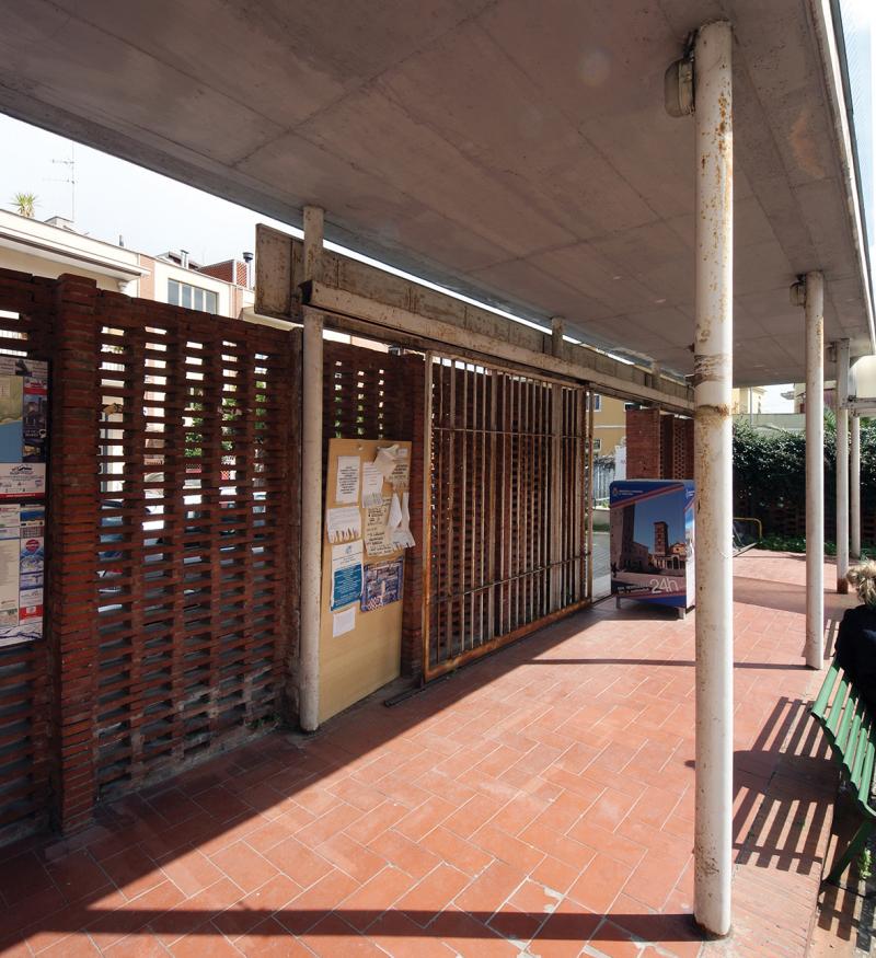 L’edificio che oggi ospita la biblioteca comunale nasce come Centro Sociale della Comunità di Terracina nell’ambito delle attività promosse da Adriano Olivetti attraverso il Movimento Comunità e rappresenta uno dei pochi centri realizzati fuori del Piemonte. Il progetto è affidato a un giovane architetto di Frascati allievo di Ludovico Quaroni che partecipa attivamente al gruppo di lavoro cui è affidata la realizzazione dell’ambizioso programma olivettiano nel dopoguerra. Il Centro, nell’ottica di favorire la crescita sociale e culturale della comunità locale ospita la biblioteca, gli uffici e una sala riunioni. L’edificio, dai semplici volumi, è organizzato intorno a una corte aperta, uno spazio fluido che connota il Centro come un luogo accogliente di incontro e di scambio. La corte è schermata verso la strada da griglie laterizie ed è articolata attraverso un porticato su pilastrini metallici e una scala libera che mette in comunicazione con il primo piano. Originale il richiamo nella facciata del corpo alto, segnata da aperture accuratamente dimensionate e proporzionate, al tema vernacolare della copertura a volta. La traccia riportata sulla parete, in forma di coronamento è, infatti, solo un’allusione come denunciano le articolate teste delle travi del telaio in cemento armato.