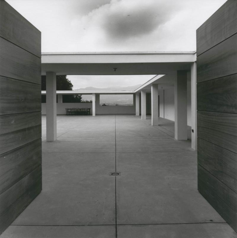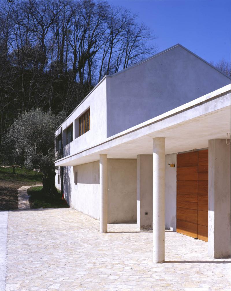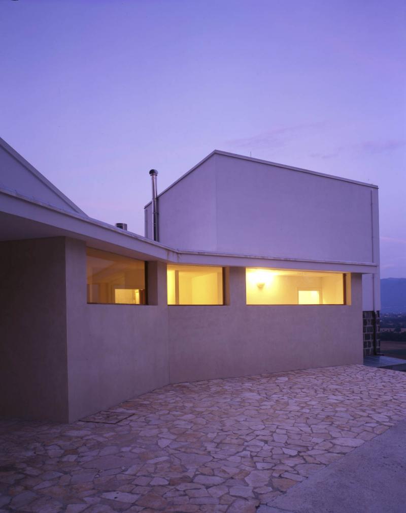 L'edificio sostituisce un precedente rudere in tufo, utilizzato come ricovero dai pastori, con prospiciente un’aia di dimensioni leggermente superiori. Il rudere, demolito e ricostruito sulla stessa area di sedime e con le pietre di tufo recuperate a formarne basamento (gli altri corpi sono ruotati rispetto al rudere di circa 45°), diviene il turrito avamposto della casa sulla valle. L’attenzione per un dialogo nuovo fra ambiente naturale ed edificio costruito, coniugato ad esigenze di sicurezza e privacy, hanno determinato la scelta di una tipologia di casa a corte a padiglioni, contemporaneamente chiusa a cittadella nella sua claustrale riservatezza e aperta con squarci e finestre sul suggestivo panorama. La grande corte costituisce il fulcro della composizione. Essa rimane definita sui lati a levante e a mezzogiorno dai padiglioni, a settentrione dal muro perimetrale con grandi aperture ritagliate sul paesaggio telesino e a ponente dal muro di appoggio per le scale che conducono al sottoportico e al primo piano.