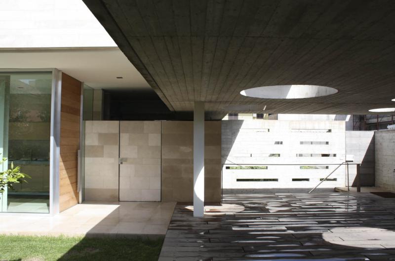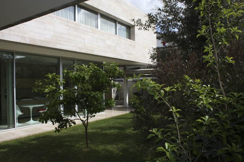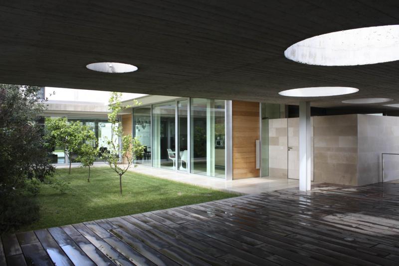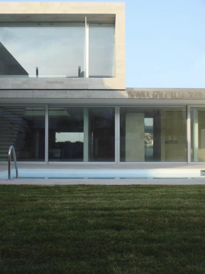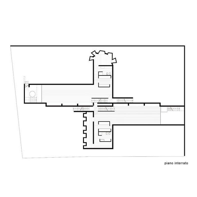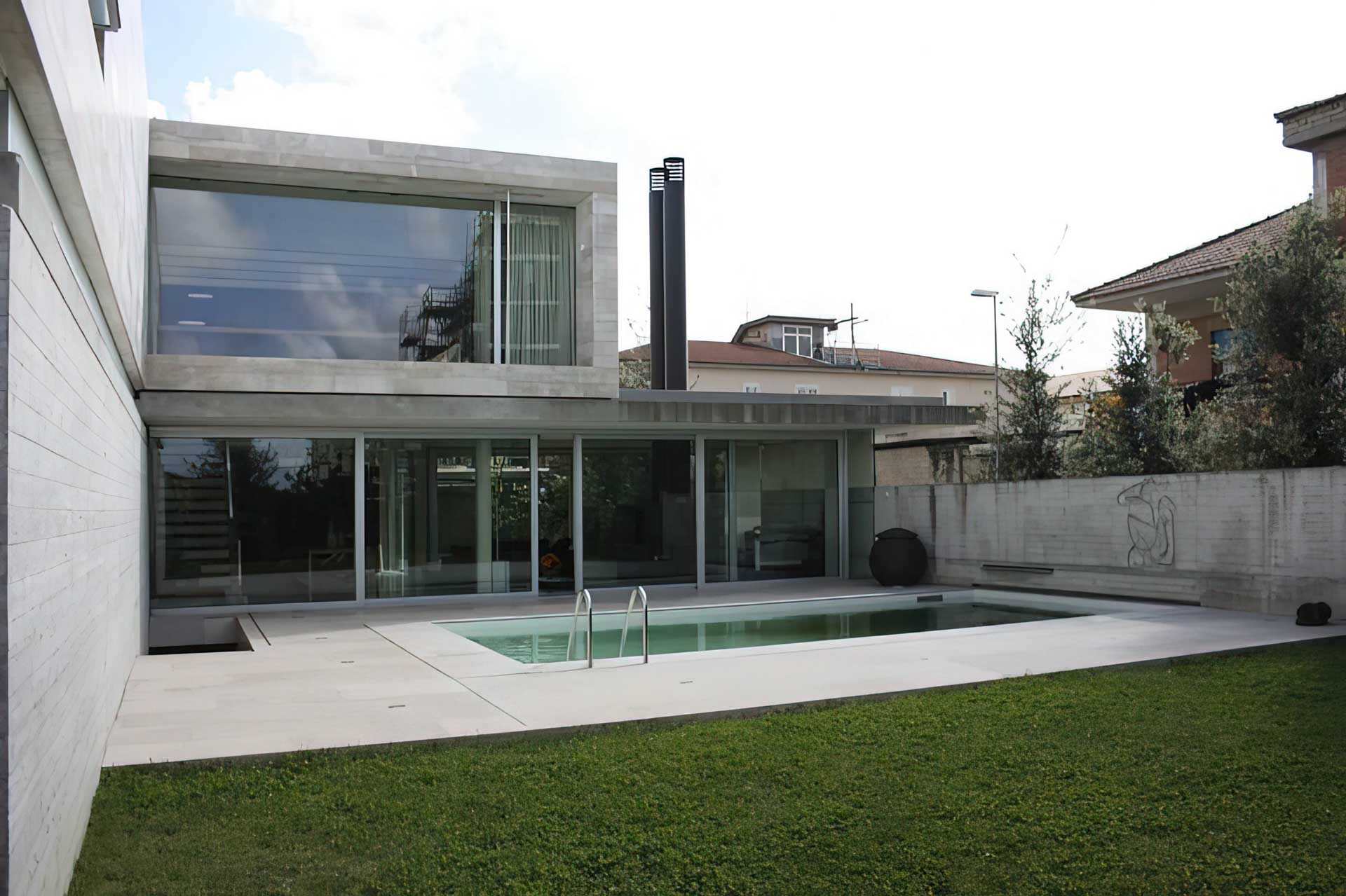 La casa doppia è una villa bifamiliare in cui le diverse parti del costruito sono organizzate intorno a più corti, ognuna con una propria identità e un proprio specifico carattere. Il muro di confine del lotto assume, insieme al verde, un definito compito di quinta. Questo segno esprime la materializzazione di un limite che rende visibile un vuoto e definisce lo spazio aperto di un patio. Le superfici vetrate al piano terra pongono la zona giorno in relazione continua con lo spazio esterno dei diversi giardini; in contrapposizione al primo piano in cui i volumi sono molto più compatti e dove vengono ospitate le camere da letto e una piccola biblioteca. I due piani sono collegati in corrispondenza di una generosa doppia altezza, caratterizzata dalla presenza di un lucernario formato da grandi travi in calcestruzzo a faccia vista. Questa casa assume una dimensione scultorea, che vive e muta nel suo rapporto con la luce che attraversa i diversi livelli. L’edificio è segnato da una netta separazione tra la libera articolazione degli spazi interni e gli elementi strutturali. Questi ultimi sono costituiti da una serie di pilastri in acciaio e una doppia parete in calcestruzzo armato a faccia vista che contemporaneamente separa e unisce le due unità abitative. I materiali utilizzati sono ridotti all'essenziale: calcestruzzo armato a faccia vista, pietra e vetro.
