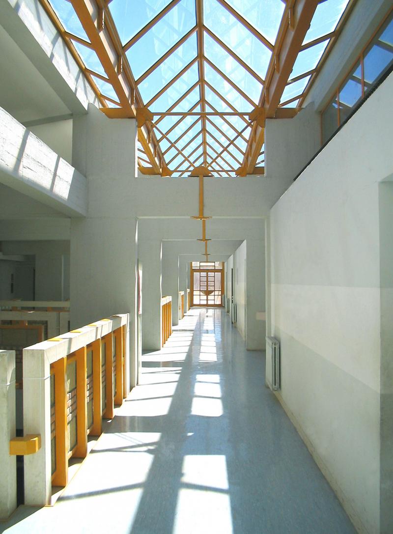 L’edificio si inserisce in un’area già occupata da due scuole: una scuola media, alla quale è direttamente collegato attraverso uno snodo che ospita l’atrio generale e la biblioteca; un istituto tecnico, con cui si ipotizza un uso condiviso della palestra e dell’aula magna.