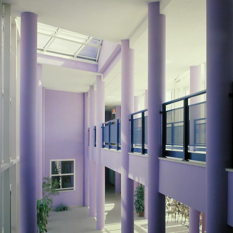 Impostato su una rigorosa geometria, il lungo prospetto è animato da una parete libera, un setto murario con bucature in posizione avanzata rispetto alla vetrata retrostante, secondo un motivo ripreso anche nella parte finale dell’appendice per schermare le scale di emergenza. Ispirati a temi più giocosi e giocati su scelte cromatiche decise sono gli ariosi e vivaci spazi di connessione e il cortile, cuore della scuola, su cui affacciano le pareti vetrate degli spazi comuni e che è attraversato da pensiline libere sostenute da colonne che si propongono come elementi liberi superando in altezza la soletta della pensilina.