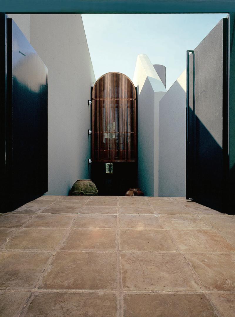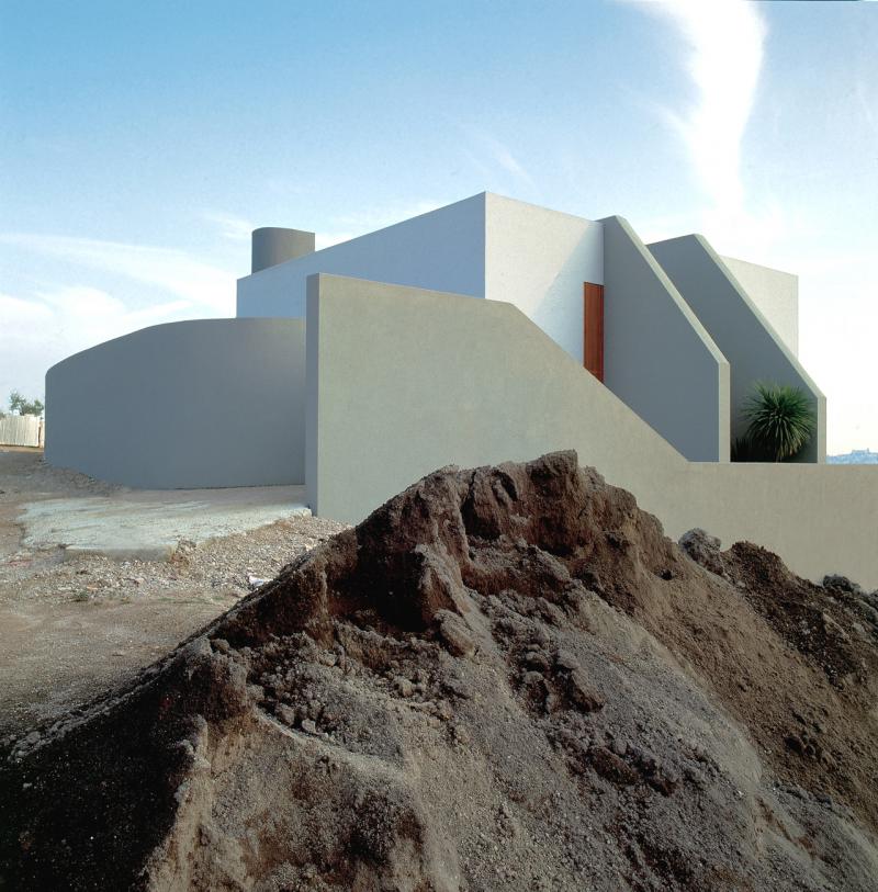 La chiara distribuzione interna si riflette nei definiti volumi squadrati, trattati con intonaco bianco, a cui sono accostati i cilindri dei corpi scala e dei camini, dipinti in grigio scuro. Le superfici bianche con le fitte schermature in legno richiamano il linguaggio dell’architettura tradizionale mediterranea reinterpretata in chiave moderna.