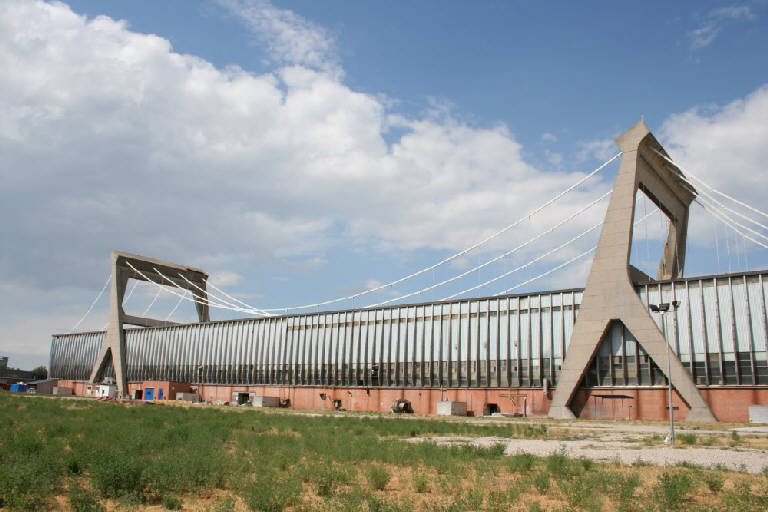 L'edificio è formato da un ponte sospeso composto da due coppie di piloni in cemento armato a cavalletto, rastremati e inclinati, e da una serie di catene metalliche che sorreggono un grande traliccio in acciaio alto 1,50 m, il quale funge da copertura della fabbrica. In pianta, è un lungo parallelepipedo con ingombro circa 250x30 m. alto 20 m.