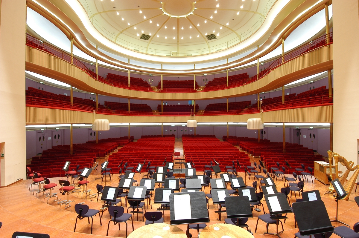 Il foyer è ampio ma sobrio e si sviluppa rettangolarmente, accanto alla sala, da cui si accede dalle porte laterali e da quelle retrostanti, sul lato sinistro dell'edificio. La sala emiciclica è caratterizzata dalla forma a ferro di cavallo con un'ampia platea di poltrone in velluto rosso e due ordini di palchi; il primo ordine ospita due postazioni di videoripresa aggettanti rispetto al limitare del parapetto. Il boccascena ospita il golfo mistico che risulta ribassato rispetto al piano del palco scenico, sulla cui parete di fondo trova posto il coro, posizionato su cinque file, e l'organo a canne.