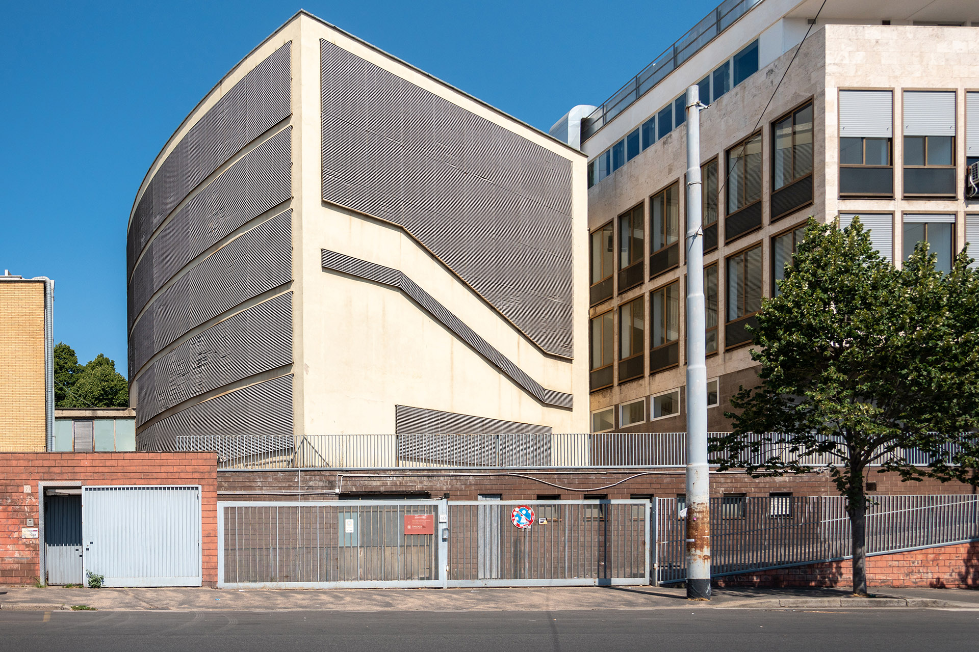 Il primo ambito è quello dell’obitorio, collocato nel settore ovest dell’area, nel punto in cui il piazzale del Verano piega verso via Cesare de Lollis. Esso si presenta come un volume poco sviluppato in altezza, interamente rivestito in cortina di laterizio e misurato dalla successione regolare di finestre verticali.
